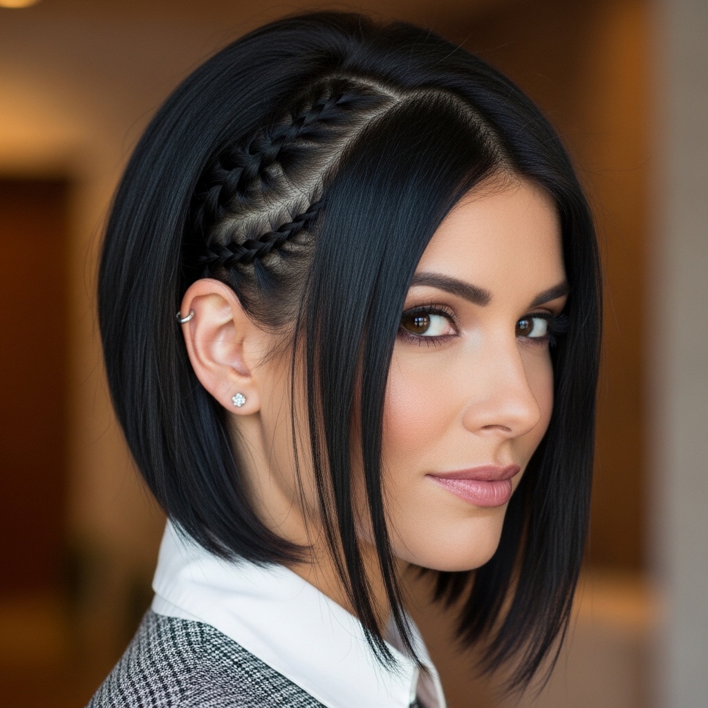 It looks stunning with an asymmetrical lob—braid the longer side. Even a vampire haircut or romantic goth hairstyles are amplified with a dark, textured laced braid for detail.