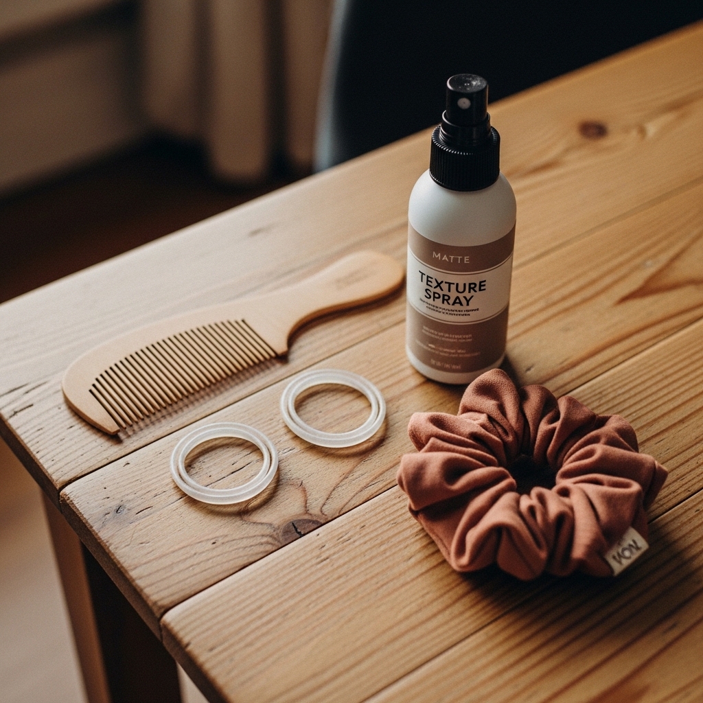 You don’t need a salon’s worth of products. Simplicity is key here. Gather a fine-tooth comb for clean sections, a couple of clear elastic bands, and a light-hold hairspray or texture spray.