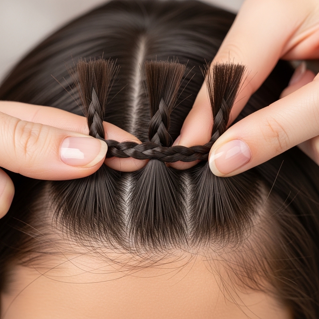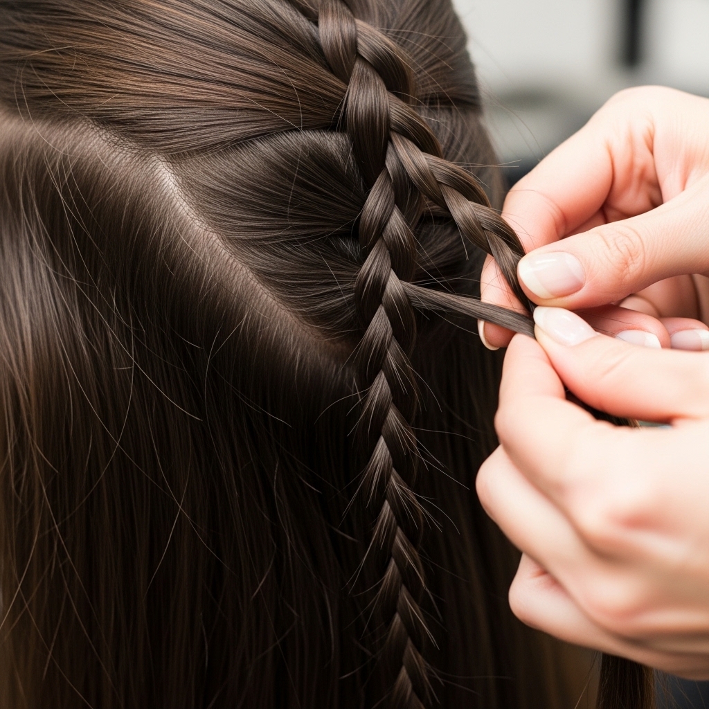 At the start of your part, take a small triangle of hair. Divide it into three equal strands. This is your foundation. Keep your grip firm but gentle—you don’t want to pull too tight.
