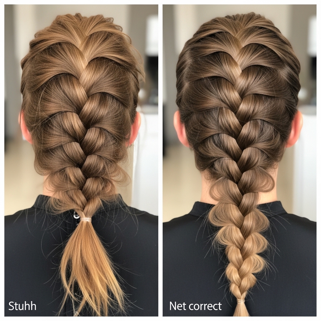 Mistake 1: Sections too thick. This makes the braid bulky and hard to secure. Fix it by using thinner, pencil-width sections.