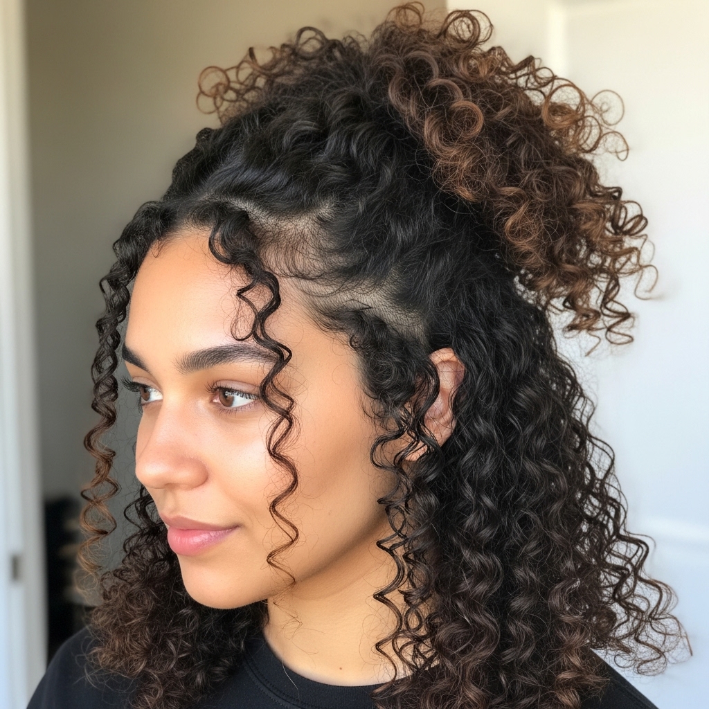Create a half-up, half-down style by gathering the top section of your hair. This hides any flat roots at the crown while letting your best-defined curls flow freely in the back.