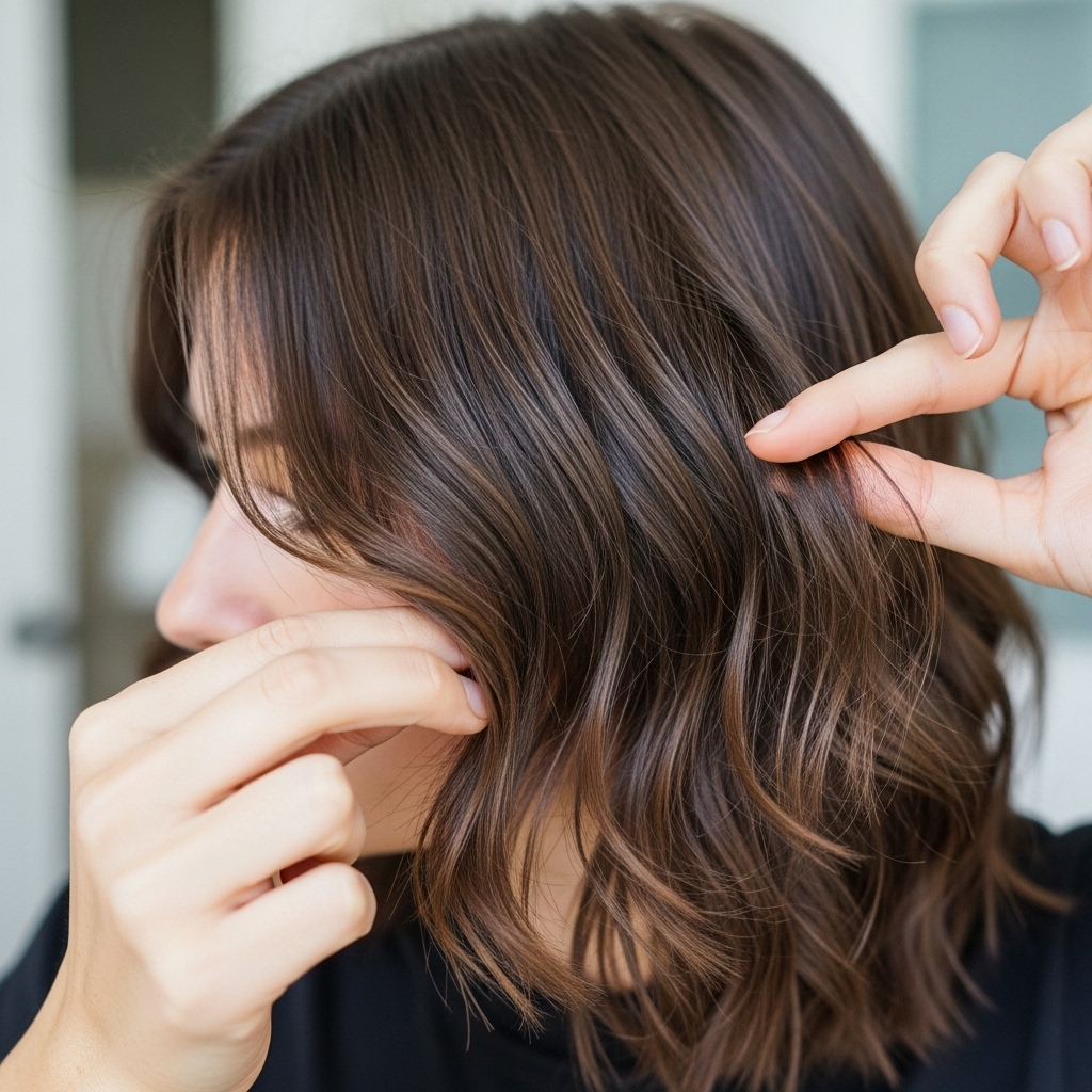 As it dries about 50-70%, gently separate the choppy layers with your fingers. Don’t comb or brush it, as this will smooth out the texture you’re trying to build. The goal is to encourage the layers to fall naturally and piece apart. This process requires very little active time—just a few touch-ups as you go about your morning routine. Embracing your hair’s natural texture, whether it’s wavy, slightly curly, or straight with body, is what makes the choppy look so personal and cool.