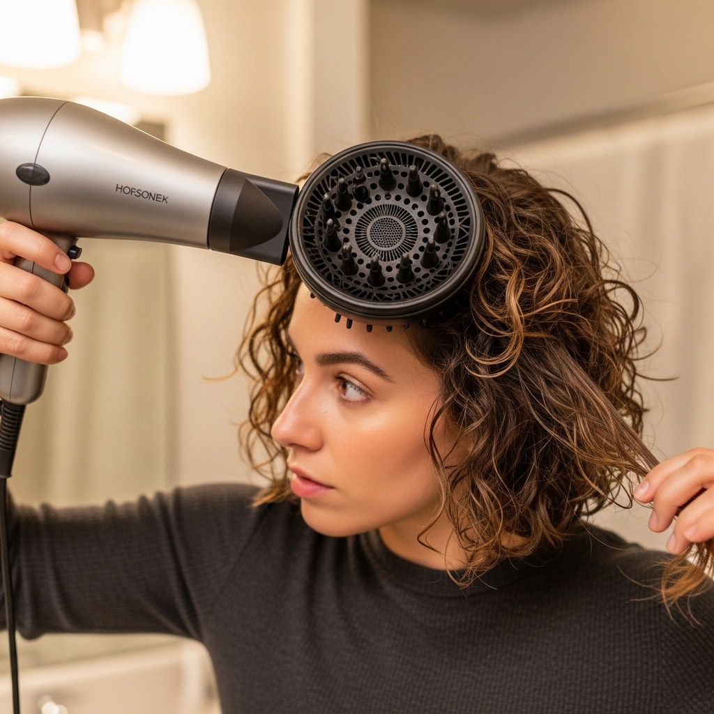 Attach the diffuser to your hairdryer and set it to a low heat and low speed setting. High heat creates frizz. Place sections of your hair into the diffuser bowl, gently lift it to your scalp, and hold it there for a few minutes before moving to the next section. The “hover” technique—where you don’t actually touch the diffuser to your hair but let the warm air flow around it—is also excellent for reducing frizz. The goal isn’t to dry it 100% with the diffuser. Get it about 80% dry and then let the rest air dry. This saves time and minimizes heat damage. Most importantly, do not touch your curls while they are drying. This disrupts the curl pattern and creates frizz. Let the cast do its work.