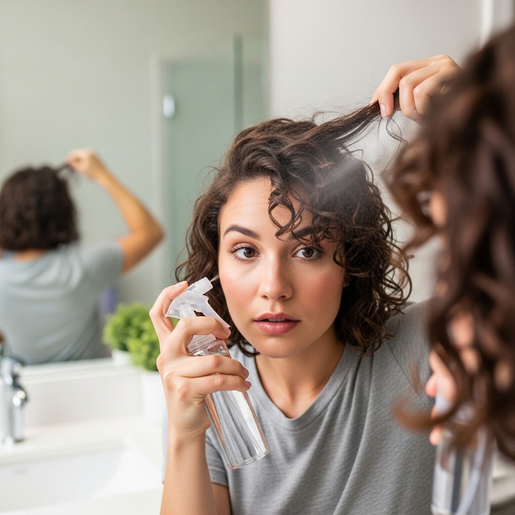First, start by flipping your head over and gently shaking your roots to restore volume. For frizz and definition, your best tool is water. Fill a spray bottle with water. You can add a tiny bit of your leave-in conditioner to it. Lightly mist your hair all over—you want to dampen it, not soak it. Then, with your hands, gently scrunch your curls from the ends upward to re-form their shape. If you have a few particularly frizzy sections, you can take a tiny drop of styling cream or gel, emulsify it with water in your palms, and gently glaze it over those areas. Avoid applying heavy product to dry hair, as it can lead to buildup and a sticky feel.