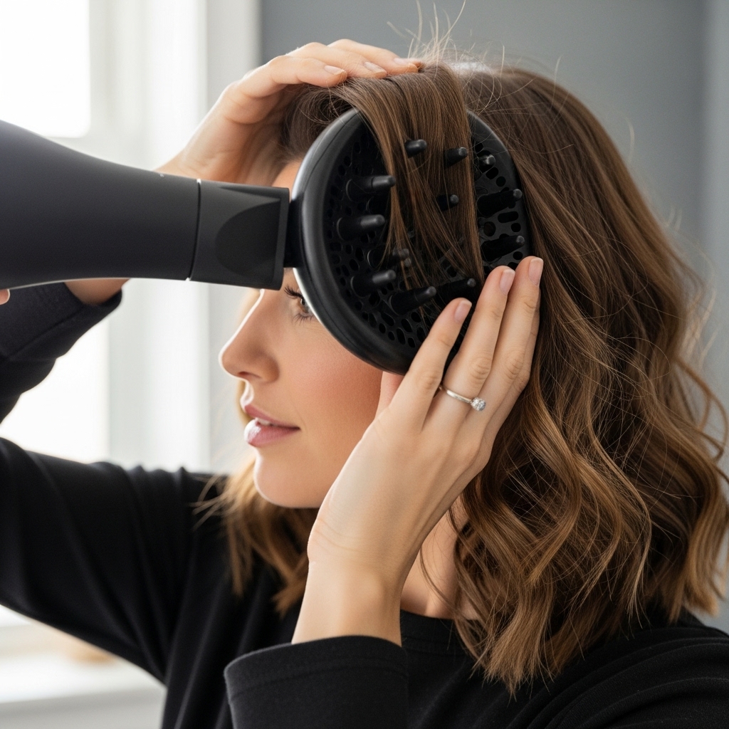 For faster, bouncier results, we recommend diffusing. Attach a diffuser to your hairdryer—this attachment spreads the airflow, preventing frizz and encouraging curls. Don’t just blast your hair randomly. Turn your hairdryer on a low heat and speed setting. Cup sections of your hair in the diffuser, bringing it up to your scalp, and hold it there for a few minutes before moving on. This technique, known as “hover diffusing,” sets the root for volume. Then, switch to “pixie diffusing,” where you place sections of your hair into the bowl and hold it in place. Always dry your hair until it is 100% dry and the gel cast has formed for the longest-lasting waves.