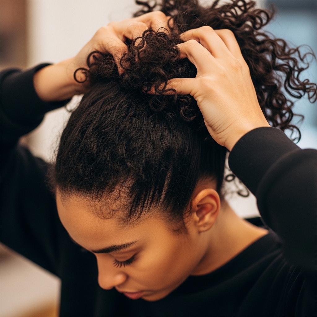 A flat ponytail is a sad ponytail. The beauty of a curly ponytail lies in its magnificent volume. If you find your crown area looking a little flat after securing your ponytail, there’s an easy fix.
