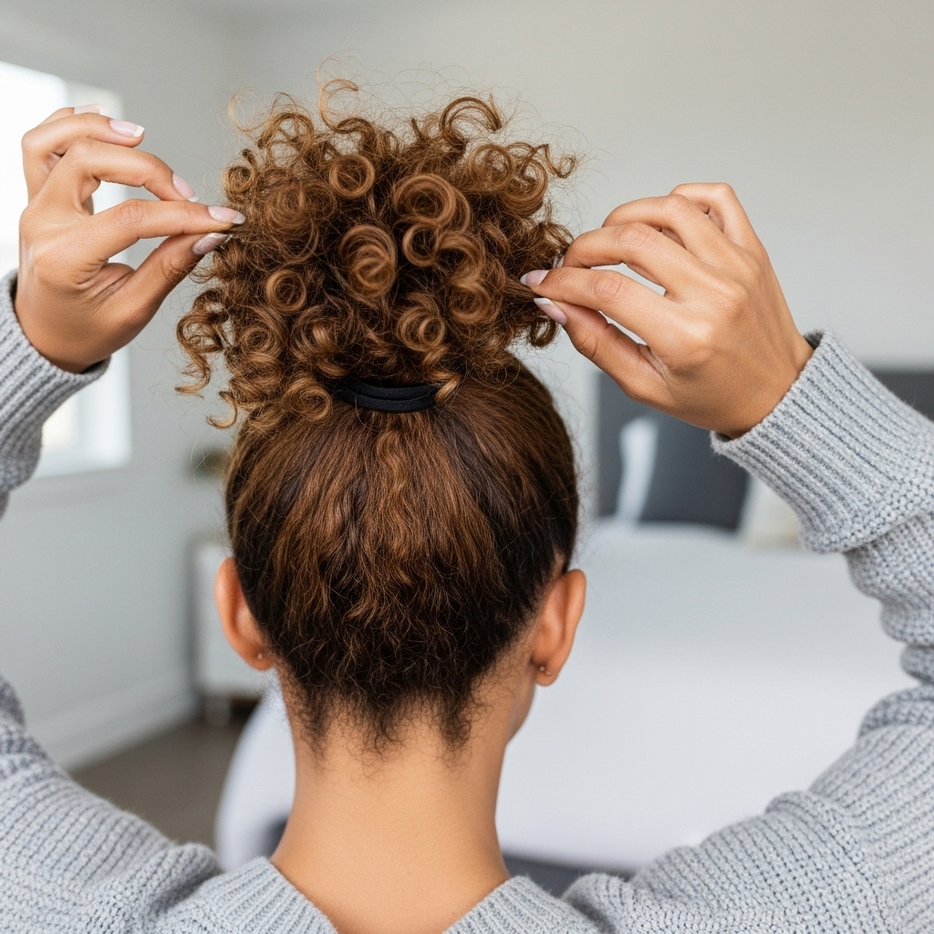 The Pony-Bun (The “Curlybun”): Why choose? Take your high or mid-height ponytail and twist it into a loose, messy bun. Don’t tuck the ends in too perfectly; let some curls frame your face and escape from the bun. It’s playful, chic, and keeps your hair completely off your face.