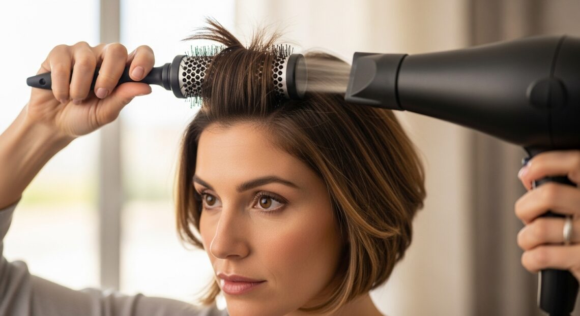 Start by towel-drying your hair and applying your preferred volumizing product. Tilt your head forward and use a round brush to lift the hair at the roots, directing the airflow from the scalp to the ends. This technique builds incredible volume at the crown. For the sides and back, brush the hair in the direction you want it to lay—whether that’s smooth down or with a slight flip.
