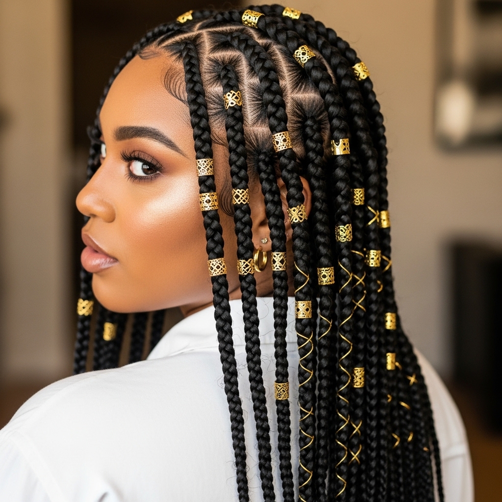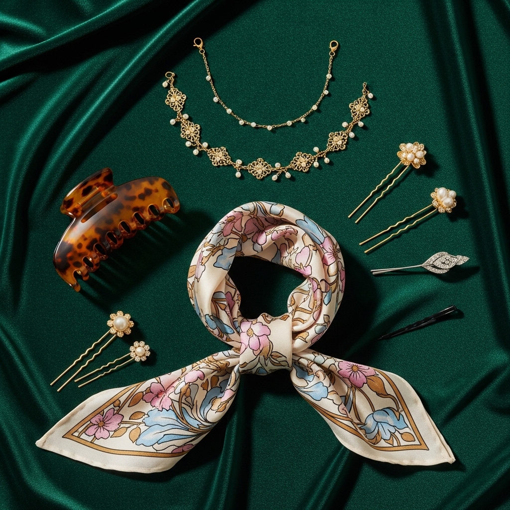 Silk and satin scarves are both stylish and functional, preventing friction and frizz. Try tying one as a headband or a chic turban. Statement clips and claws are perfect for creating half-up, half-down styles or pinning back sections of your hair. For a boho-chic vibe, incorporate head chains or delicate chains into your braids and twists. Don’t underestimate the power of a vibrant beanie or a trendy cap for bad hair days—just pop your hair into a pineapple or loose bun underneath.