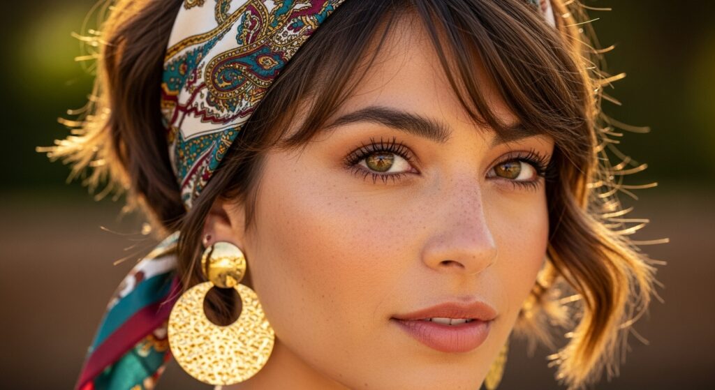 Headbands and Scarves: A thin, elegant headband can add a touch of boho or retro glamour. Similarly, a silk scarf tied around your head like a headband or woven through your hair adds a pop of color and pattern, perfect for a summer day or a special event.
