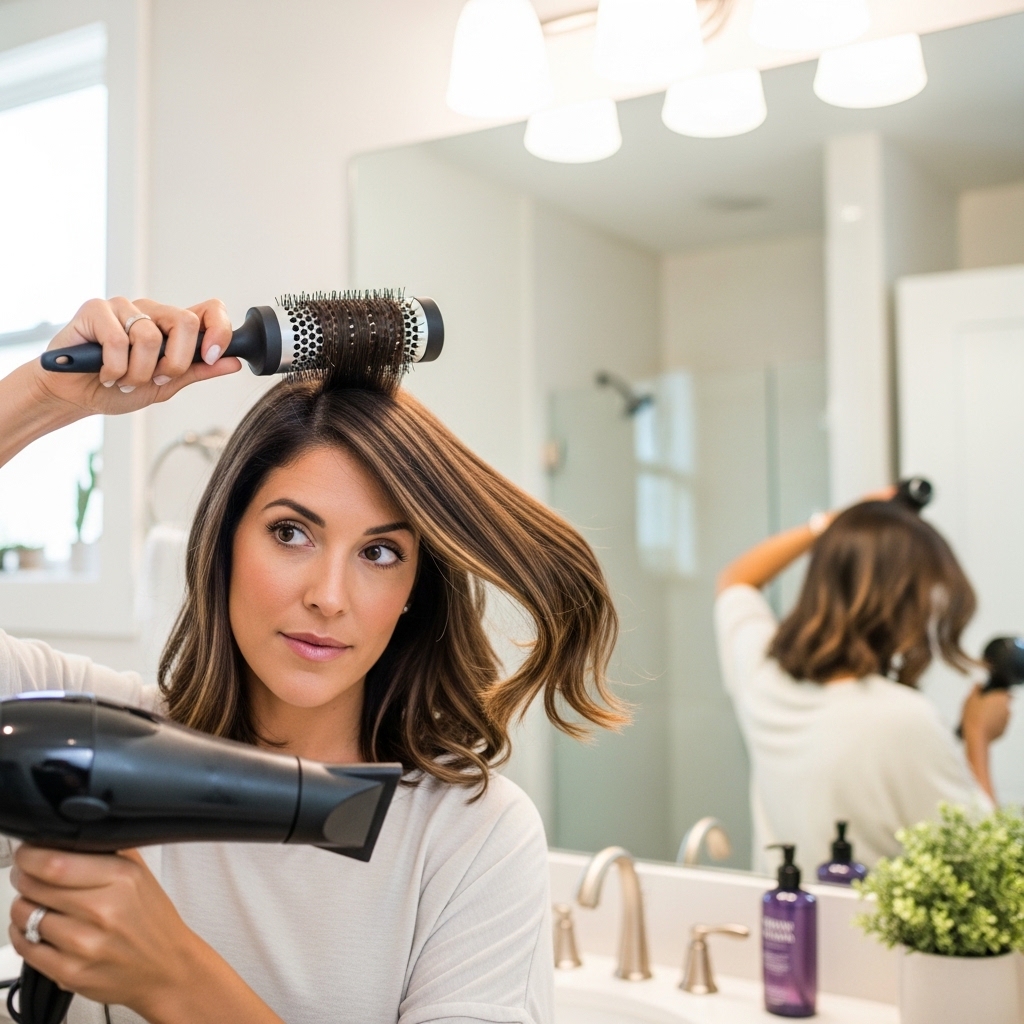 Use a medium-sized round brush. For the longer side, wrap the hair around the brush and pull down and slightly away from your face. For the shorter side, focus on lifting the roots. The goal is smoothness with body, not pin-straight.