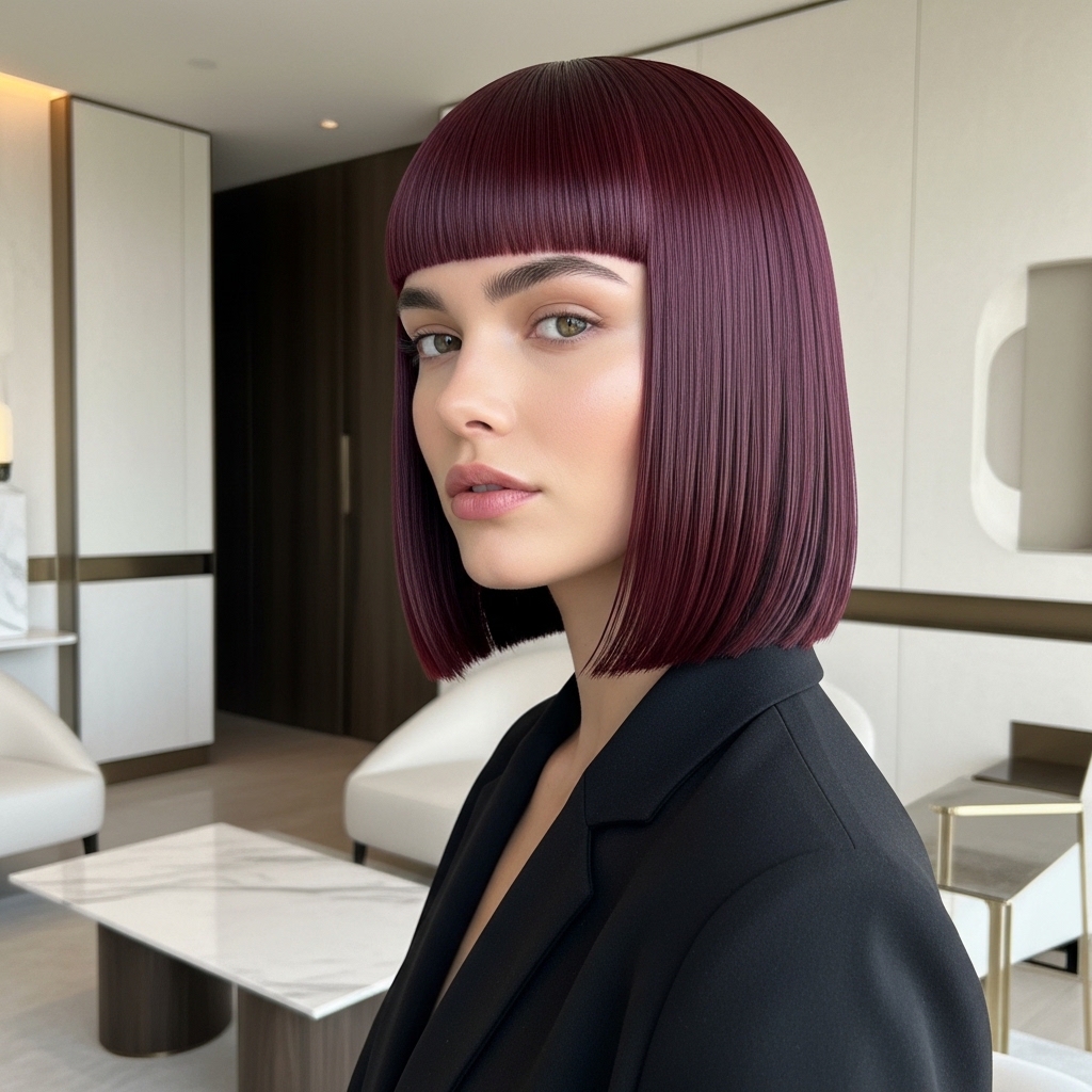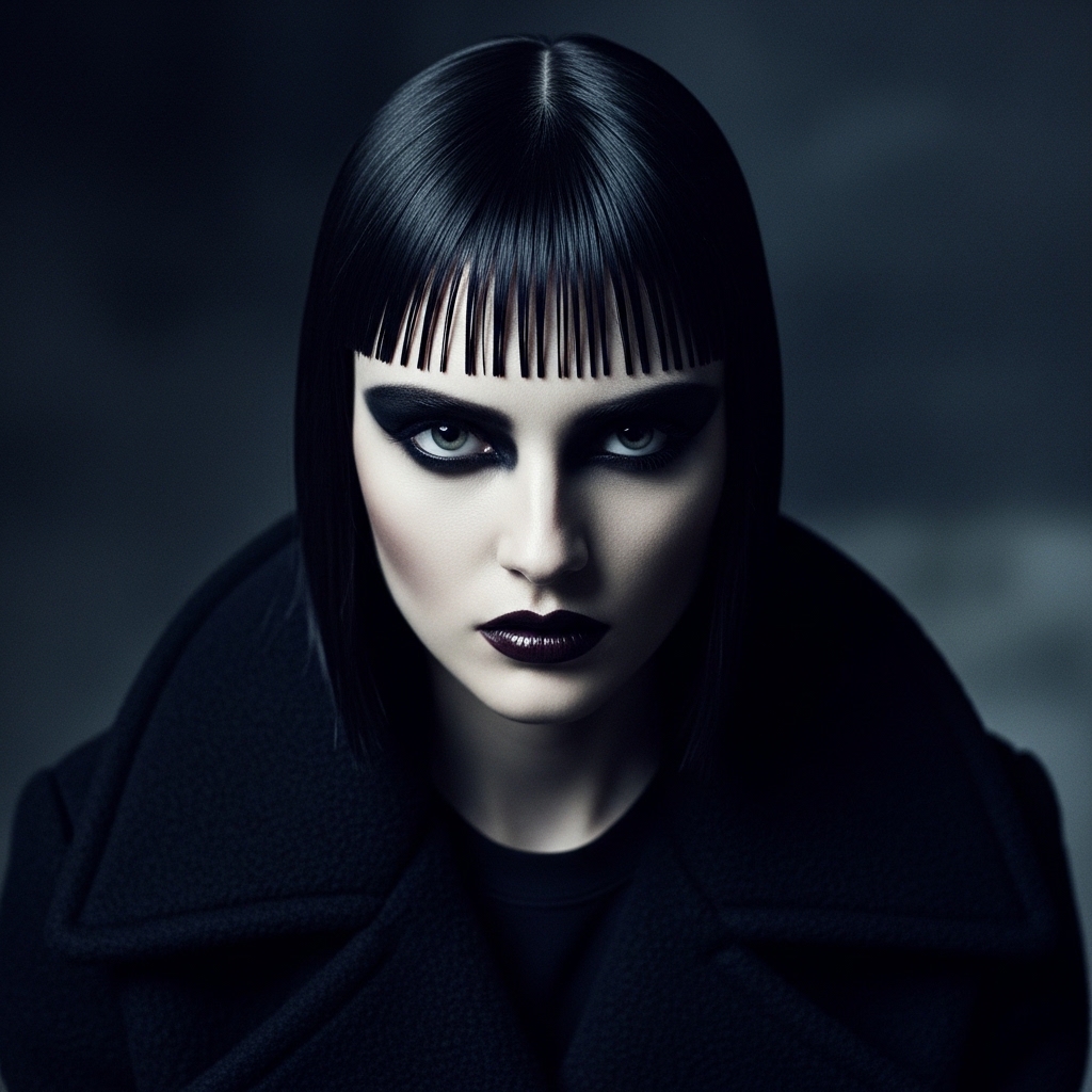 It creates a dramatic, geometric shape that’s hard to miss. Today, it’s been remixed into so many vibes—from old money hair with a polished finish to romantic goth hairstyles with a dark, poetic feel. It’s all about that striking contrast.