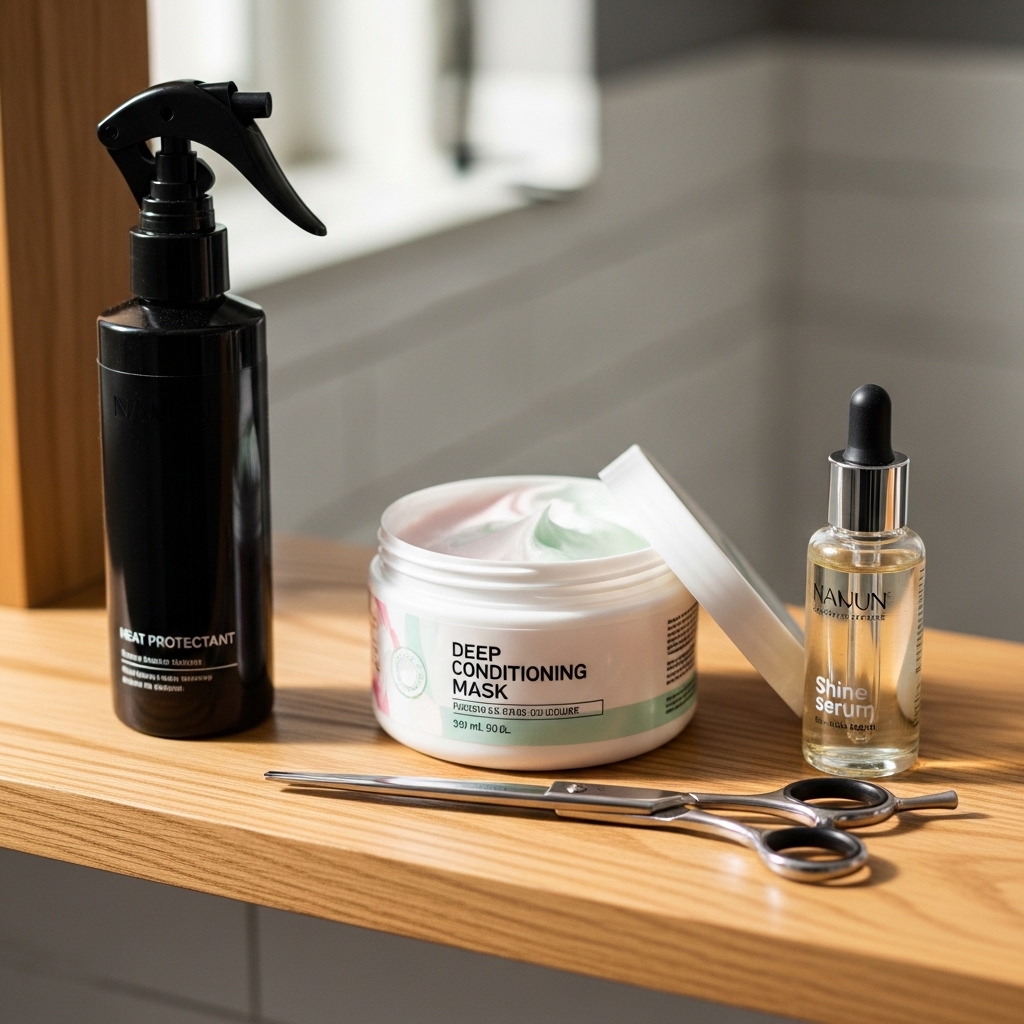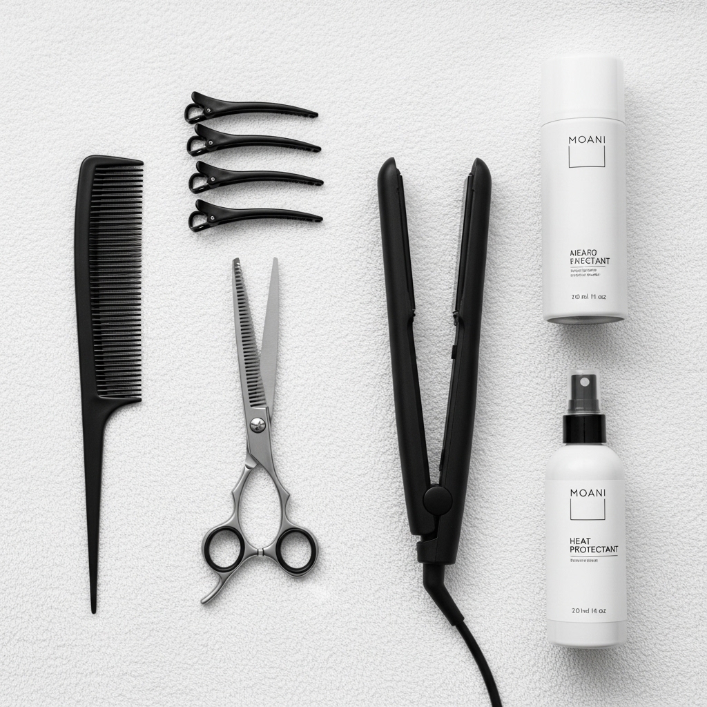 Don’t worry, you don’t need a pro kit. Just gather these basics: a fine-tooth comb, hair clips to section your hair, sharp hairdressing scissors (please, not the kitchen ones!), a flat iron, and a heat protectant spray.