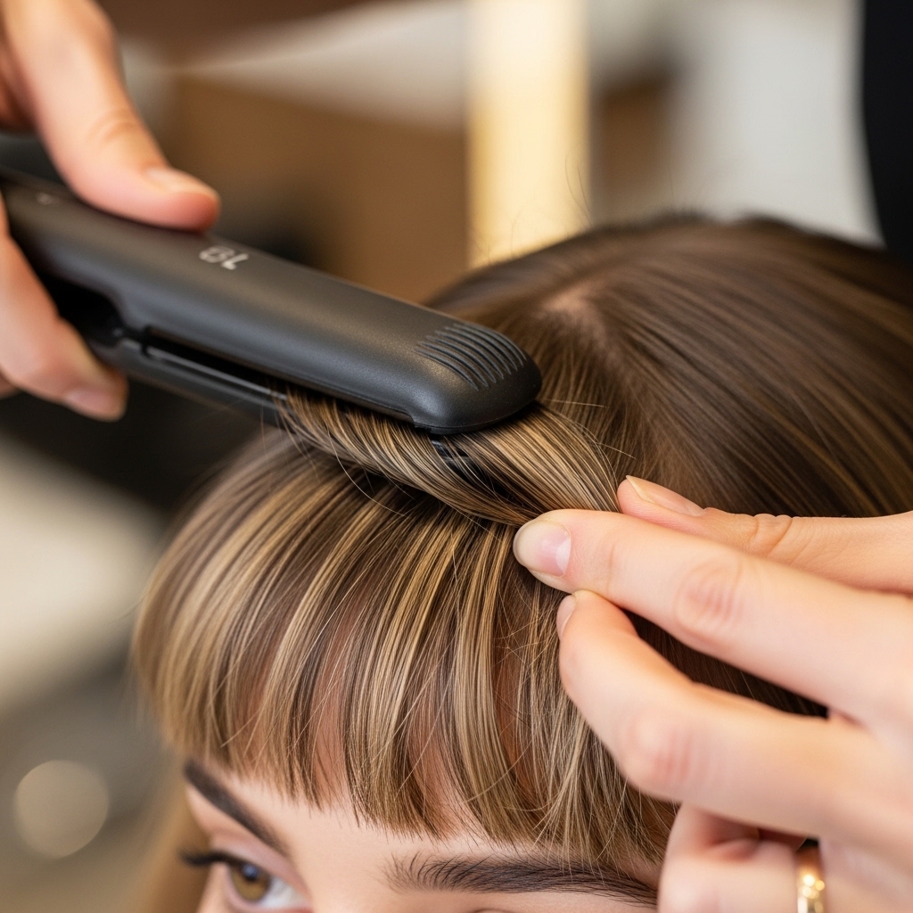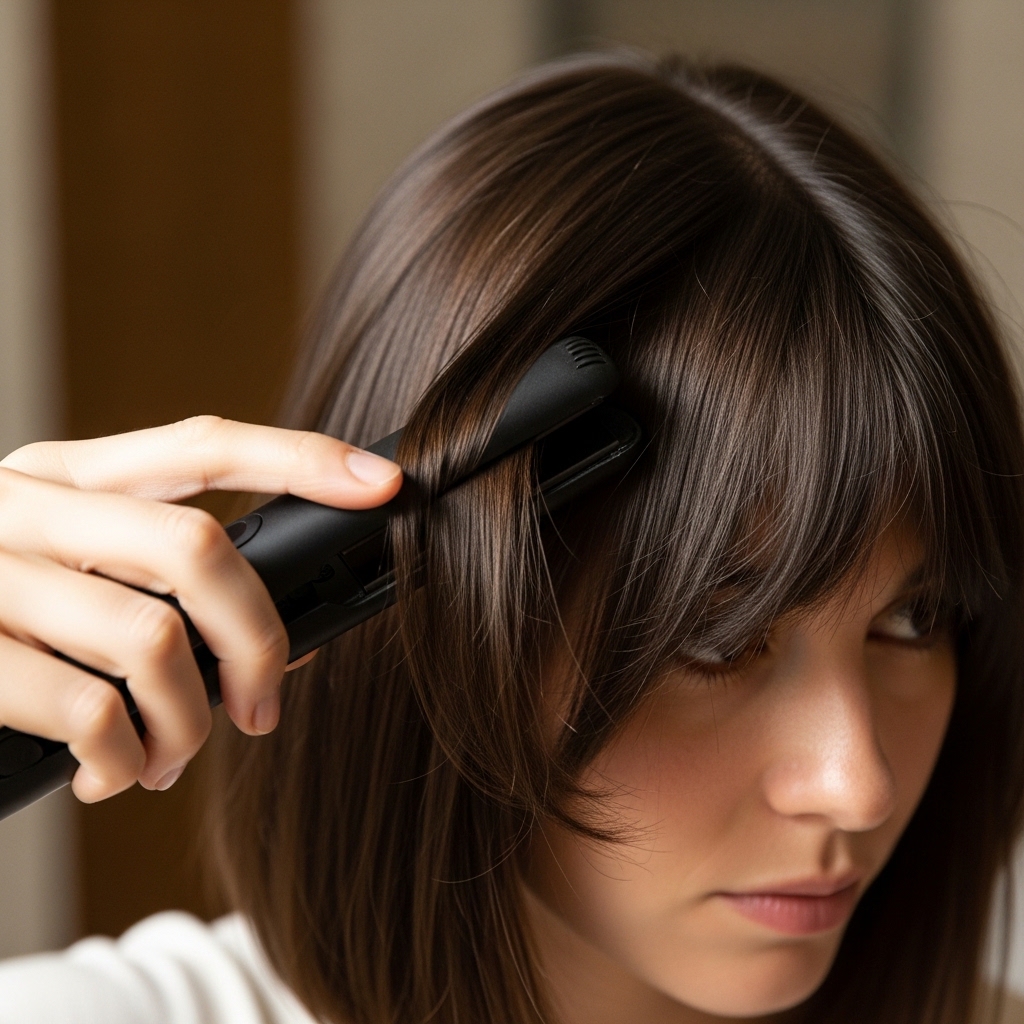Do NOT just flat iron your bangs straight down. That creates a hard, flat sheet. Instead, take vertical sections. Twist them slightly and clamp the iron mid-way down, pulling gently.