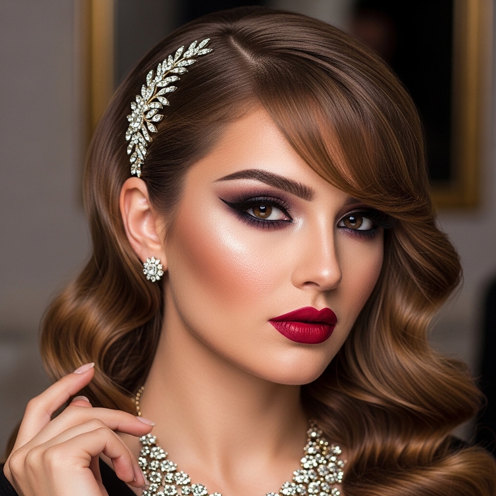 A strong lip color complements this hairstyle perfectly. It balances the edgy cut with classic glamour, perfect for a night out.