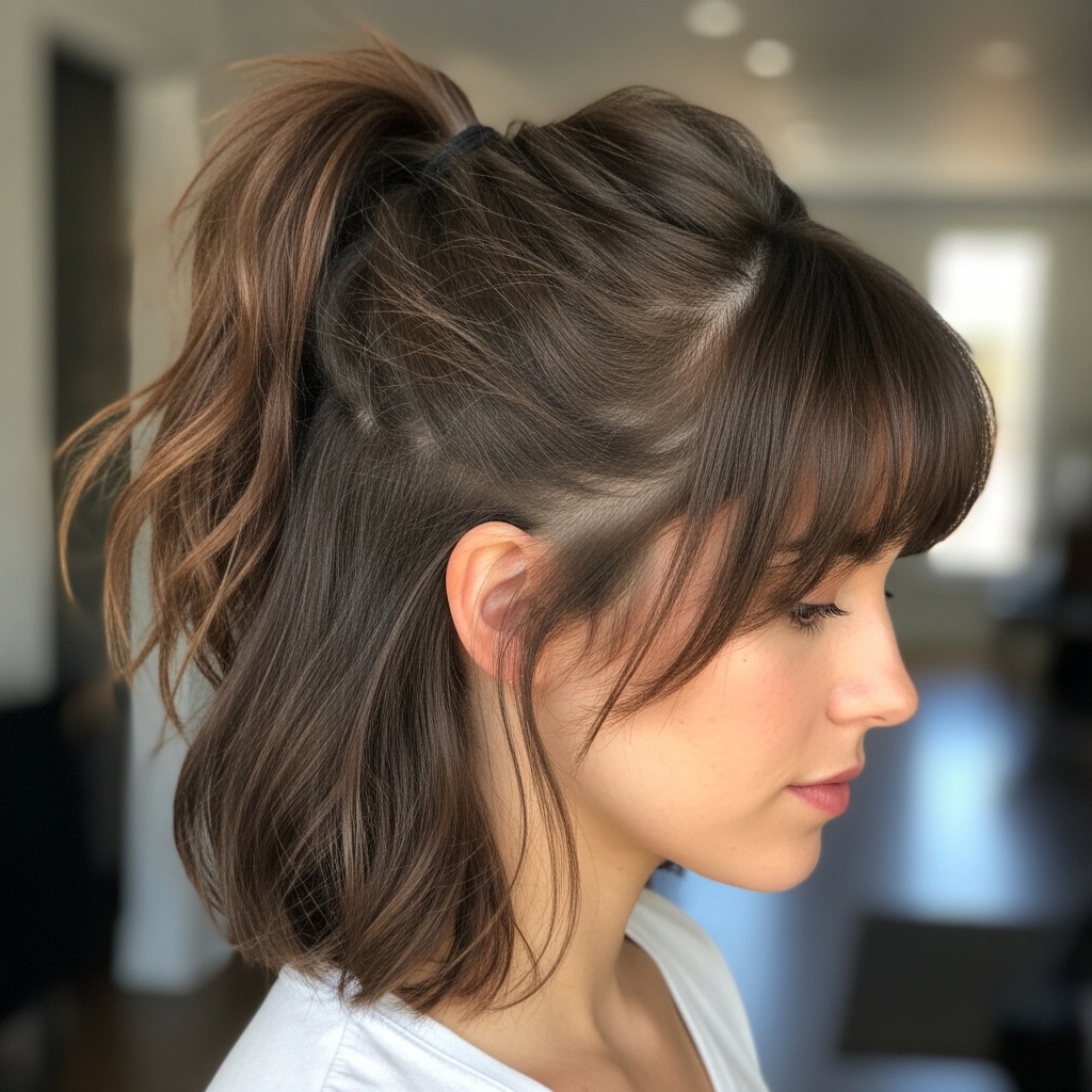 A half-up style is perfect for this cut. It shows off the short sidelocks. Try a half-up ponytail or a small claw clip at the crown.