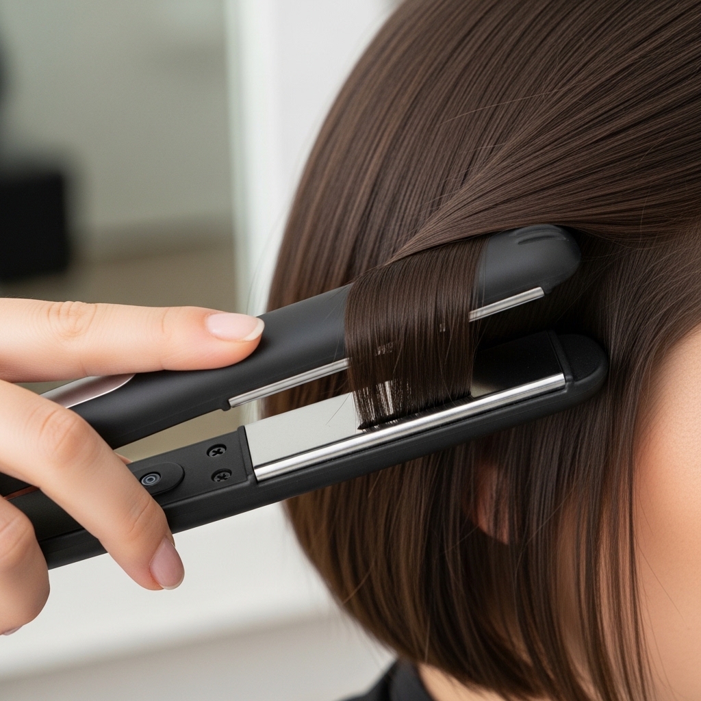 Take those cheekbone-length sidelock pieces. Use a flat iron on a medium heat setting. Clamp near the root and glide down, turning the iron slightly inward at the end.