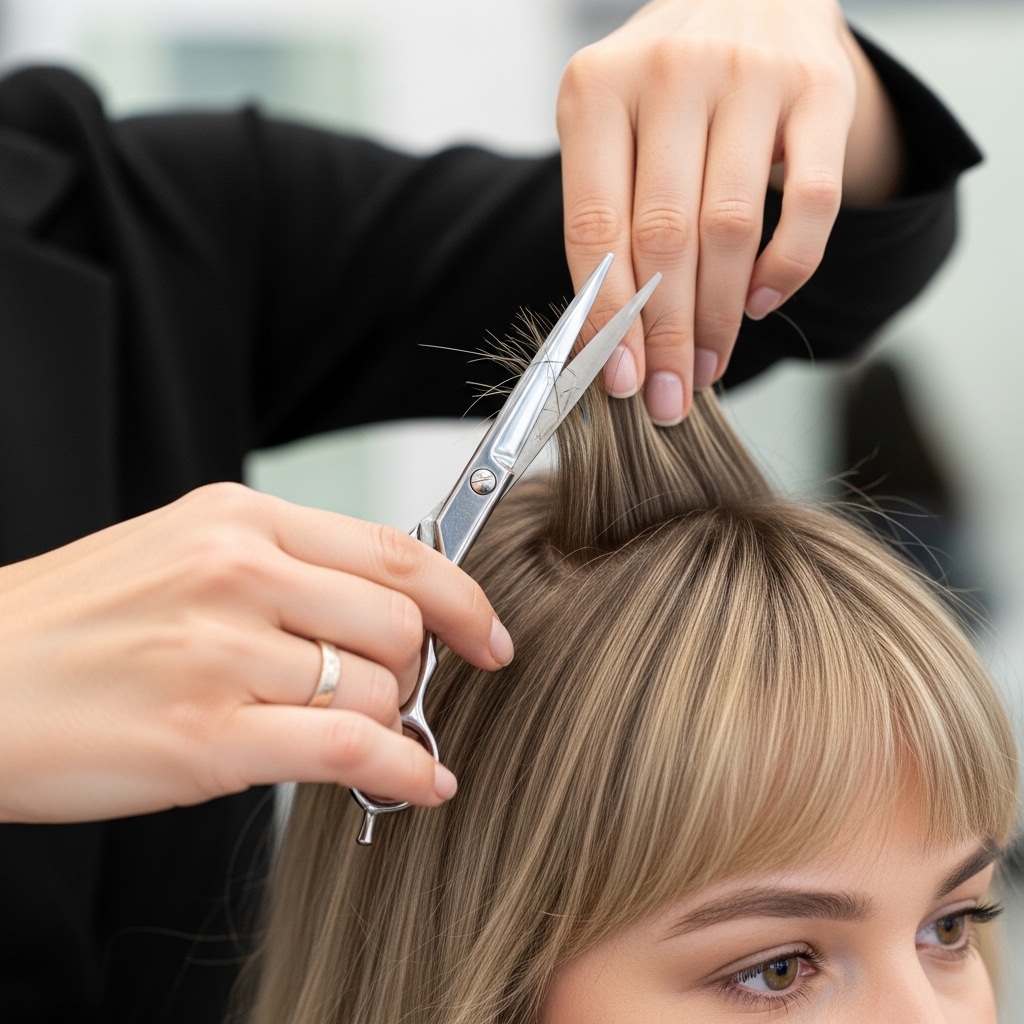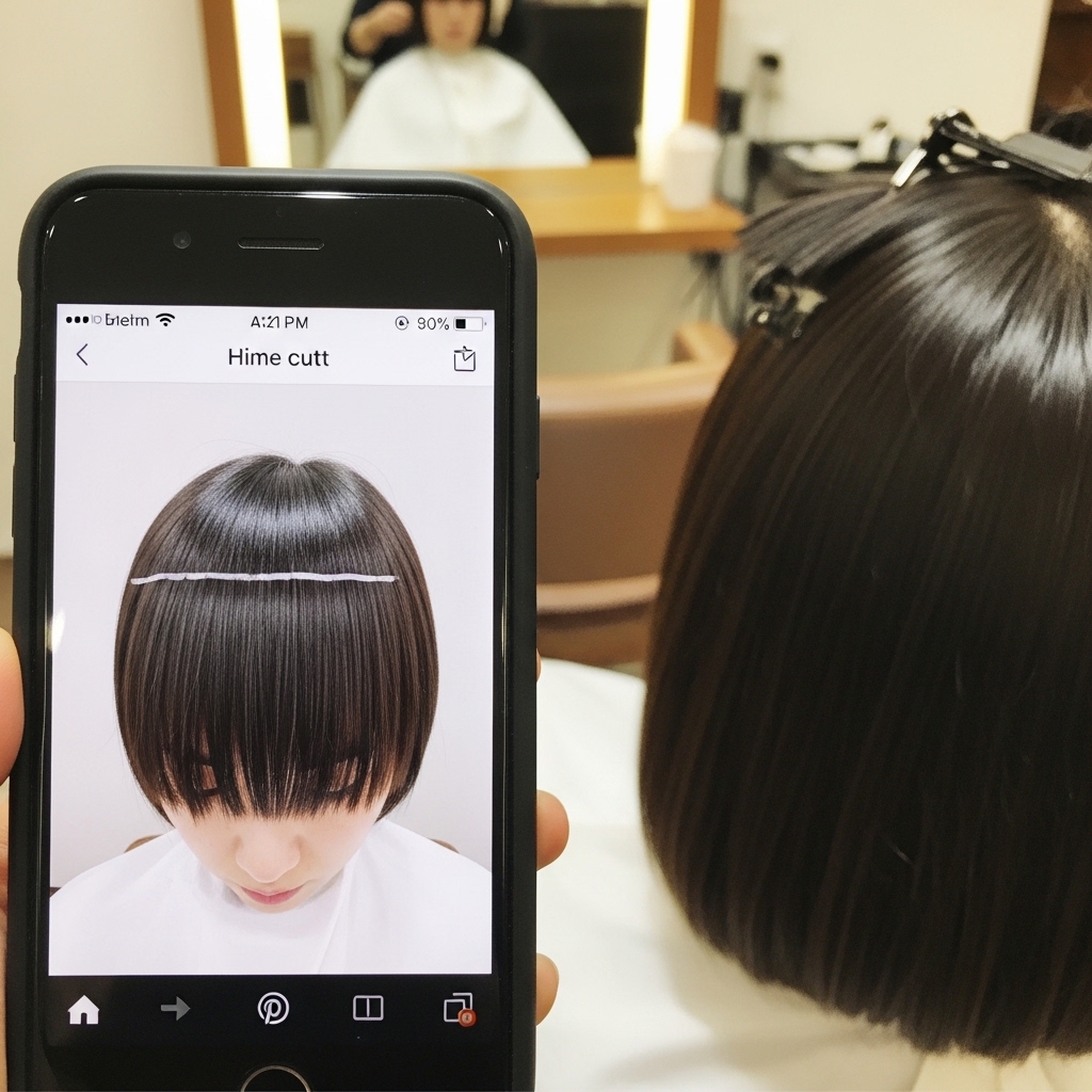 This is the most important step. You cannot just say “hime cut.” You must show a photo of the *soft* version. Say you want “softened, blended lines” and “feathered, wispy bangs.”