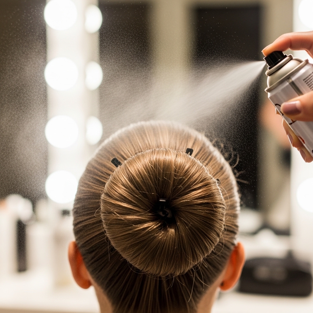 Once you’re happy with the lacing, it’s time for the final seal. Take your strong-hold hairspray. Hold it about a foot away from your head and give the entire bun a light, even mist.