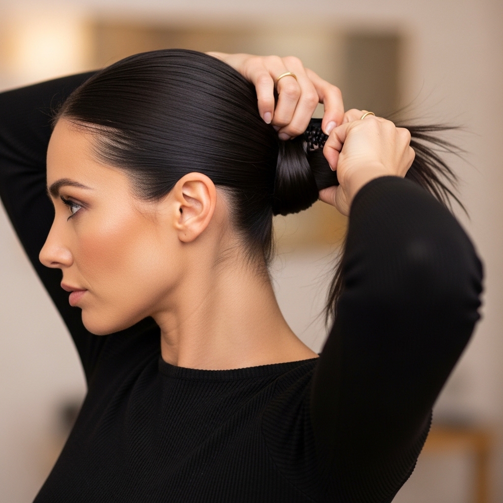 Brush your hair thoroughly to remove any tangles. Then, gather it at the nape of your neck—not too low, just where your head meets your neck. Secure it with a clear elastic. Don’t make it super tight; you want a little softness. This ponytail is the foundation for your bun.