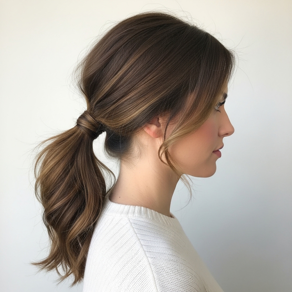 Forget the slick, tight ponytail. The choppy ponytail is all about effortless cool. Lightly backcomb the crown of your hair for volume. Then, gather your hair as if you’re putting it in a low or mid-height ponytail, but don’t pull all the pieces through. Leave some face-framing layers out. Secure with a hair tie, but on the last loop, don’t pull the hair all the way through—create a small loop. Gently pull the ponytail apart to loosen it and tug a few more pieces loose around your face and neck. Finish by applying a tiny amount of hair oil to your fingertips and pulling out a few pieces around your face to define them.