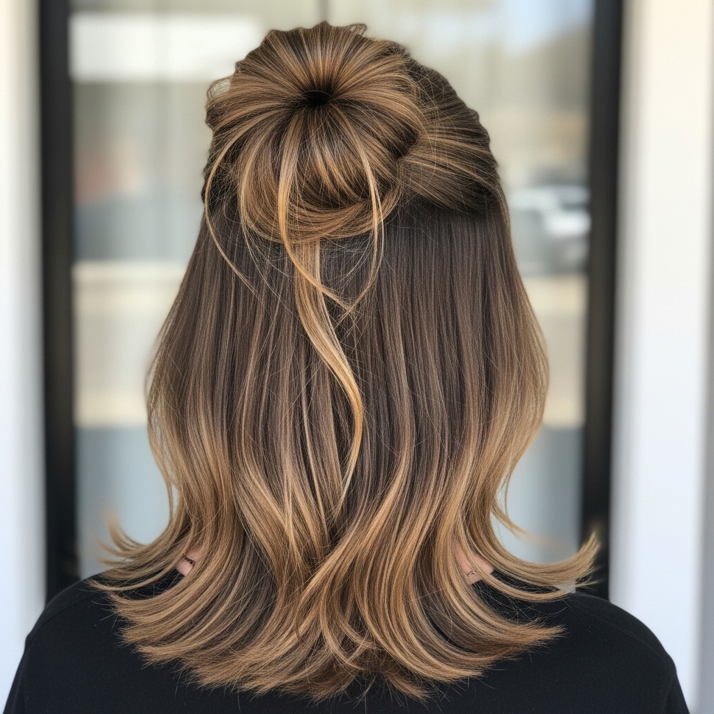 Your short layers were made for this style. Gather the top section of your hair, as if you were doing a half-up style. Instead of securing it with a classic ponytail, twist it loosely and coil it into a small, messy bun at the back of your crown. Use bobby pins to secure it, allowing pieces to fall out naturally. This style keeps hair out of your face while showcasing your beautiful layers and texture in the back. It’s playful, polished, and takes less than a minute.