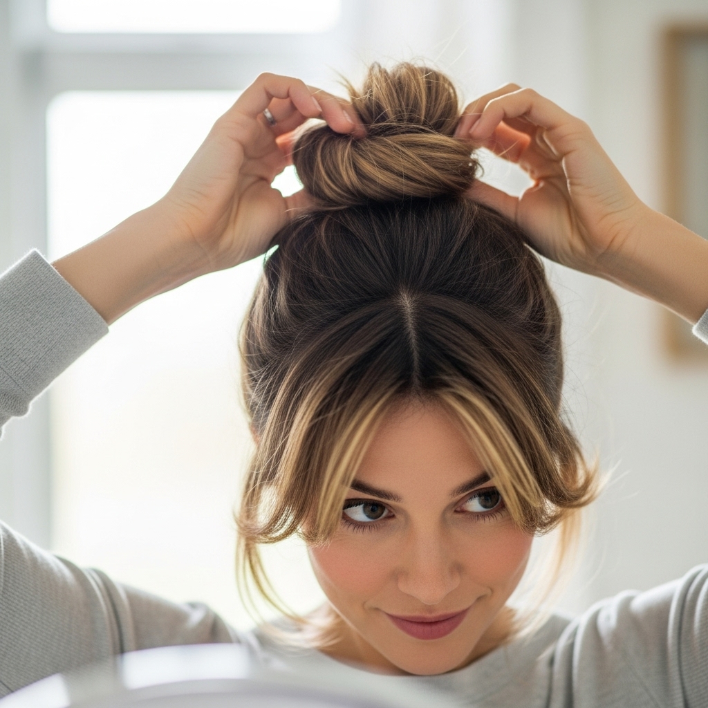 The Strategic Topknot: Before bed or on a lazy morning, gather your hair into a very loose, high ponytail or bun on the very top of your head. Secure it with a soft coil hair tie. After 30 minutes or even overnight, when you let it down, you’ll have beautiful, voluminous bends and waves.