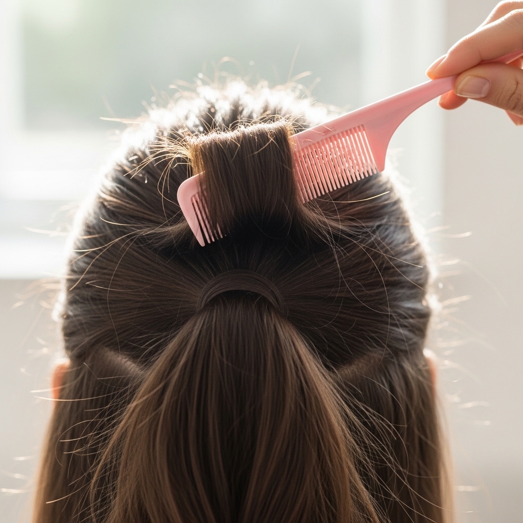 Flat hair at the crown can make a low pony feel dated. Before you secure it, use the tail of your comb to gently lift small sections at the top of your head. Just lift slightly, don’t backcomb.