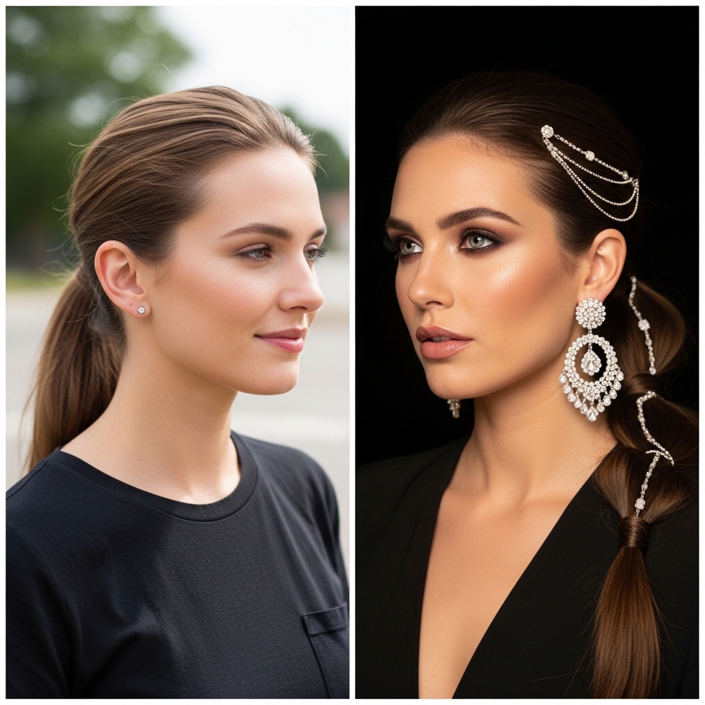 Accessories can completely change the feel. Slide a simple, elegant claw clip into the base of the pony for decoration. Or, use a beautiful silk scarf as your hair tie, letting the ends trail down.
