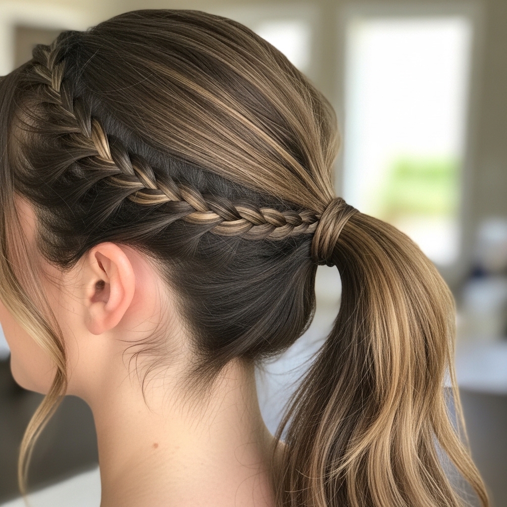 Add a touch of intricate detail by incorporating a small braid. Take a section of hair from your temple and braid it back, incorporating it into the pony. Or, braid the section you use to wrap around the base.
