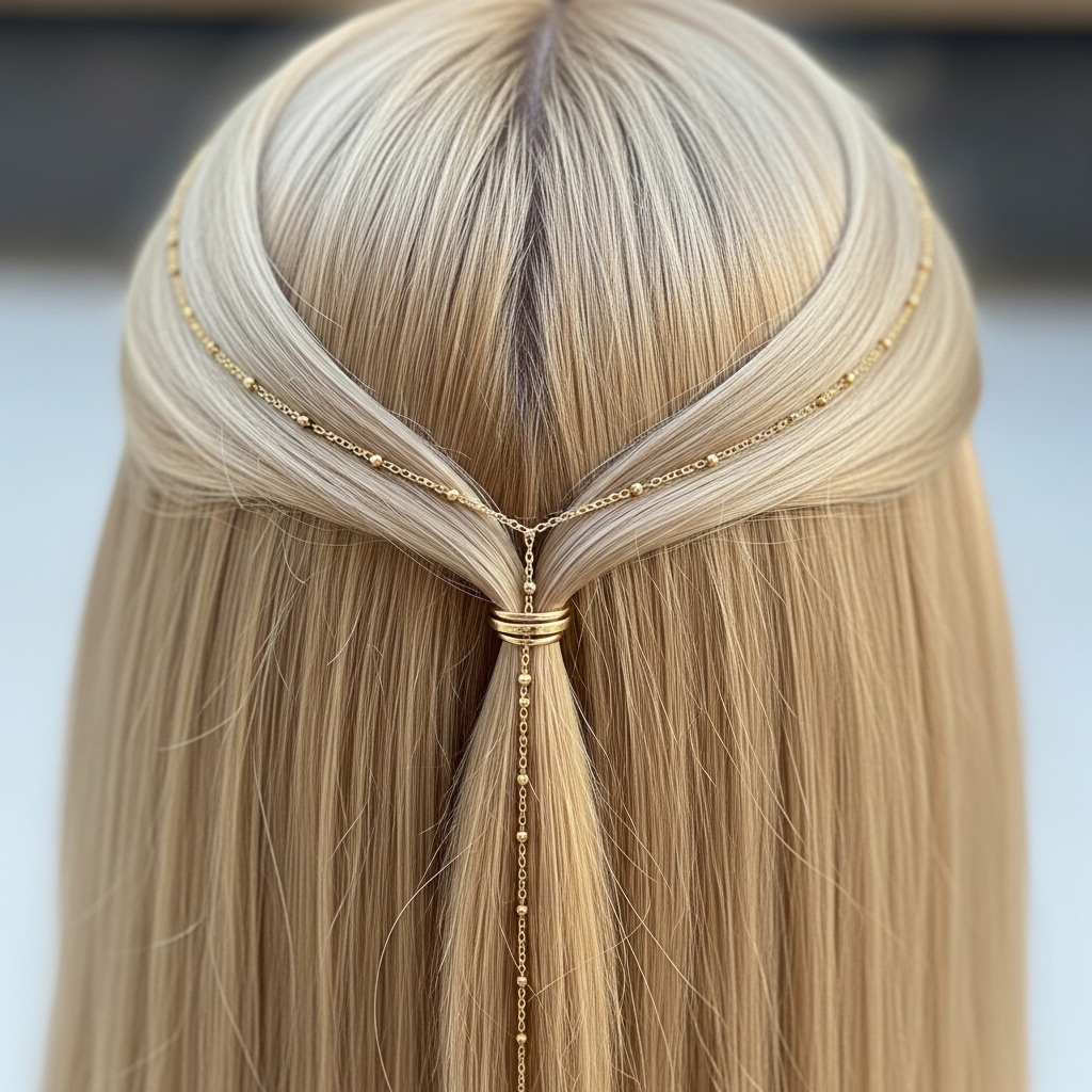 Keep it minimal. A thin, gold hair chain laid over the part. A simple silk scarf tied as a headband. Small, classic barrettes clipped back at the temples.