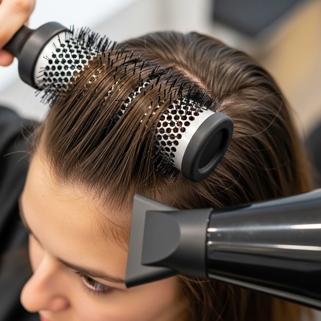 Rough dry your hair until it’s about 80% dry. Then, use a round brush to smooth each section, pulling the hair straight down from the roots. This builds the smooth base you need.