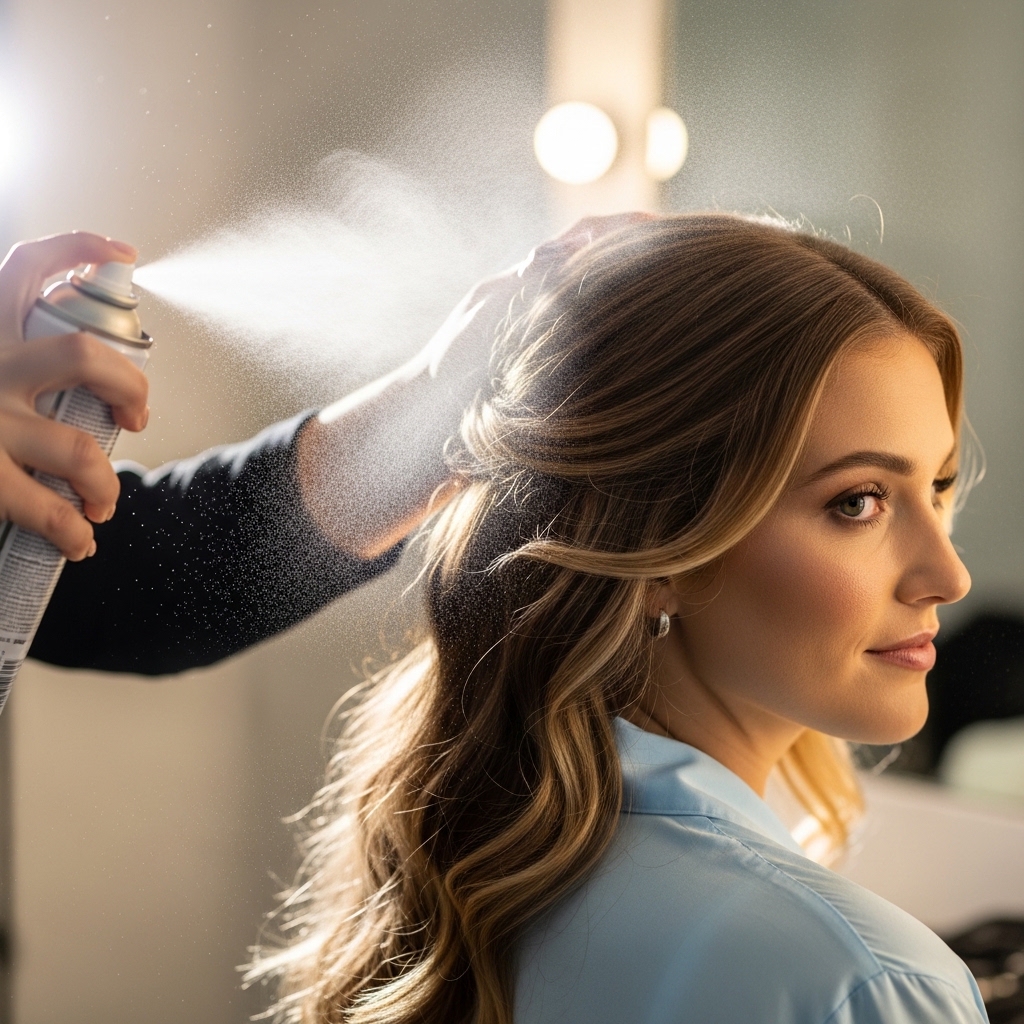 You need a flexible-hold hairspray. Avoid anything that makes hair crunchy or sticky. A light mist from about 10 inches away is perfect.