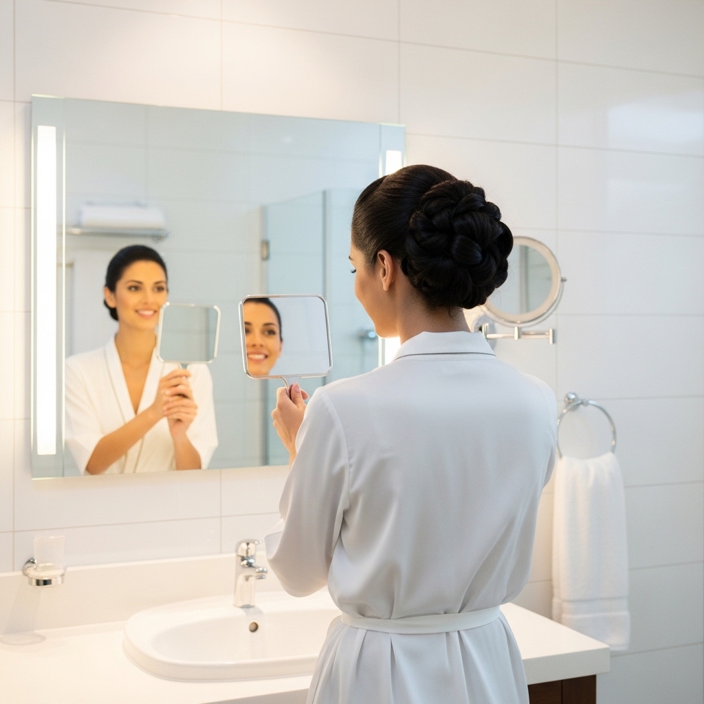 Grab a hand mirror and check the back. Look for any loose loops or ends sticking out. Gently tuck any stray pieces under the bun and secure them with an extra pin if needed.