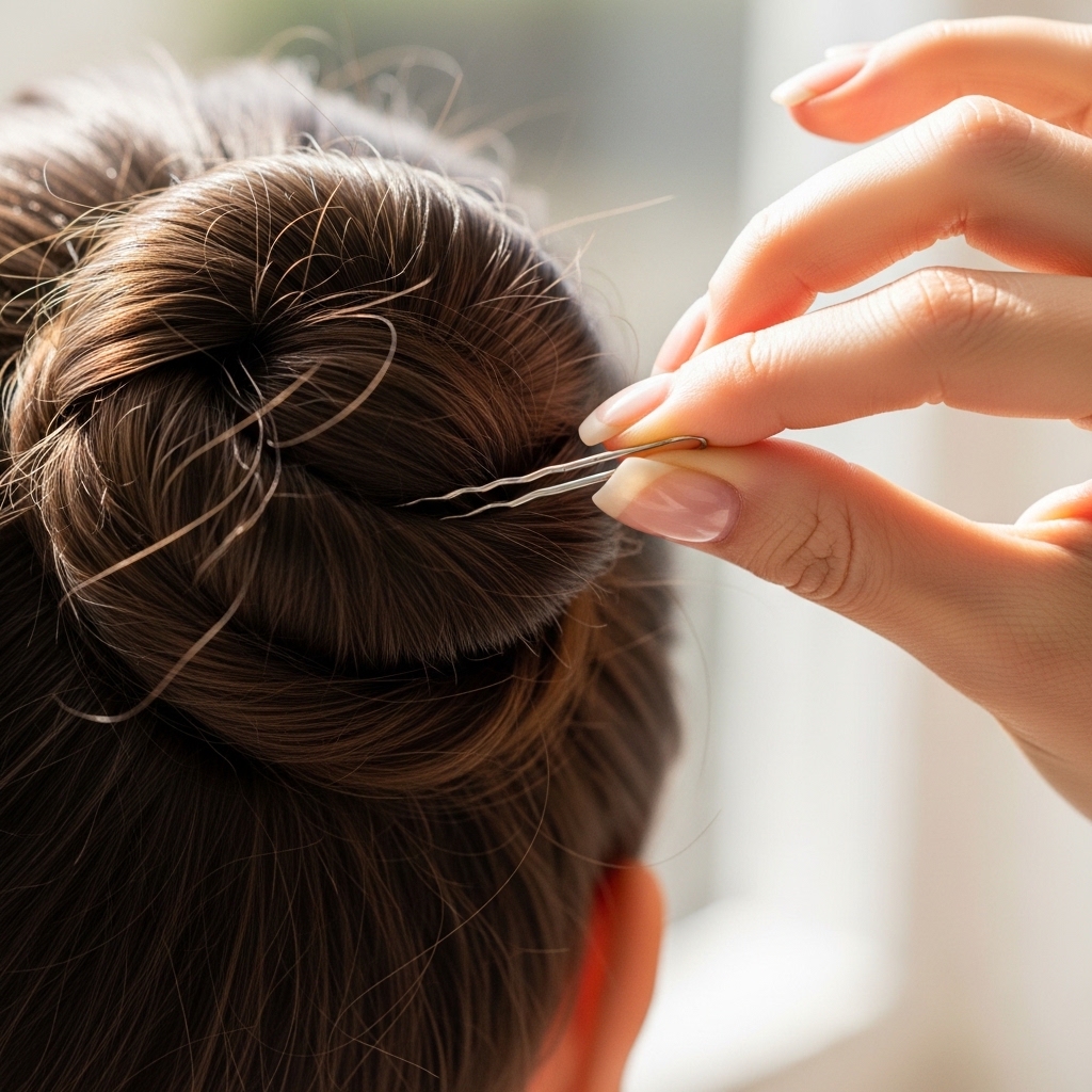 Use 4-5 pins this way, spacing them around the bun. Always insert them from the underside up so they are invisible from the front and sides. This technique locks the bun in place far better than just stabbing pins in from the top. It will feel incredibly secure.