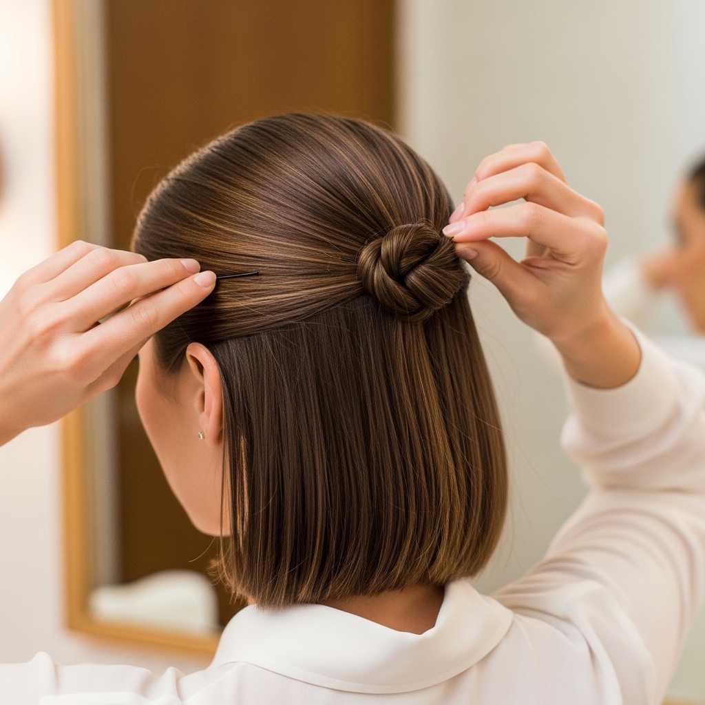 Follow the same prep. When you gather, you’ll have a shorter “tail.” Twist it and pin it flat against your head, more like a twisted knot. Use more pins to secure the ends.