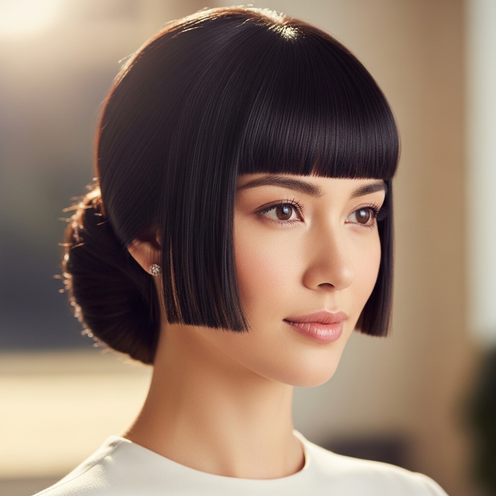 The hime cut, with its straight-across front pieces and layered back, is literally made for this style.