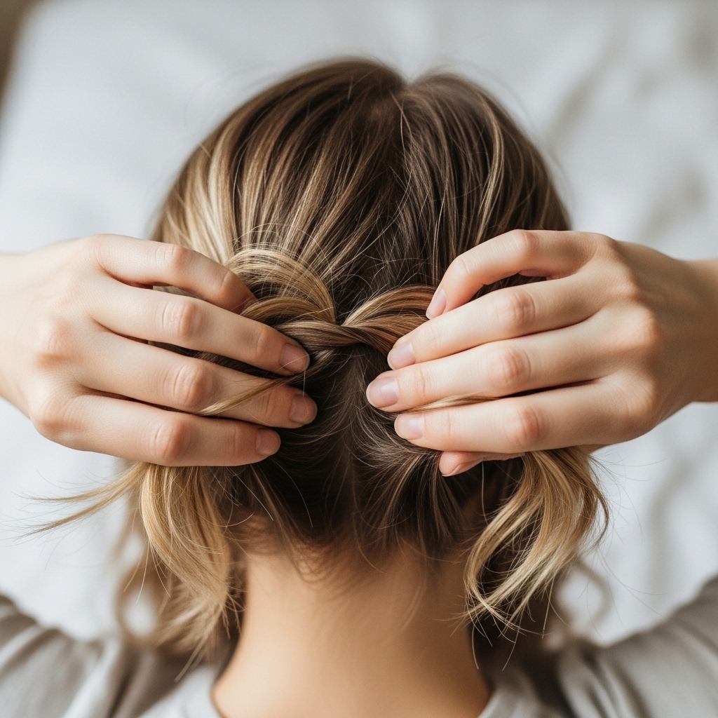 Now, take that loop and gently twist it clockwise. Don’t twist it tightly like a rope. Just one or two casual turns to organize the hair.