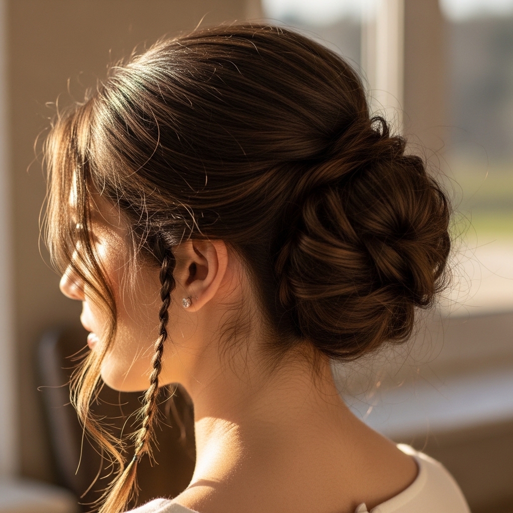 Before making the bun, braid a small section near your temple and leave it out. Wrap the rest into the bun, then let the braid hang loose.