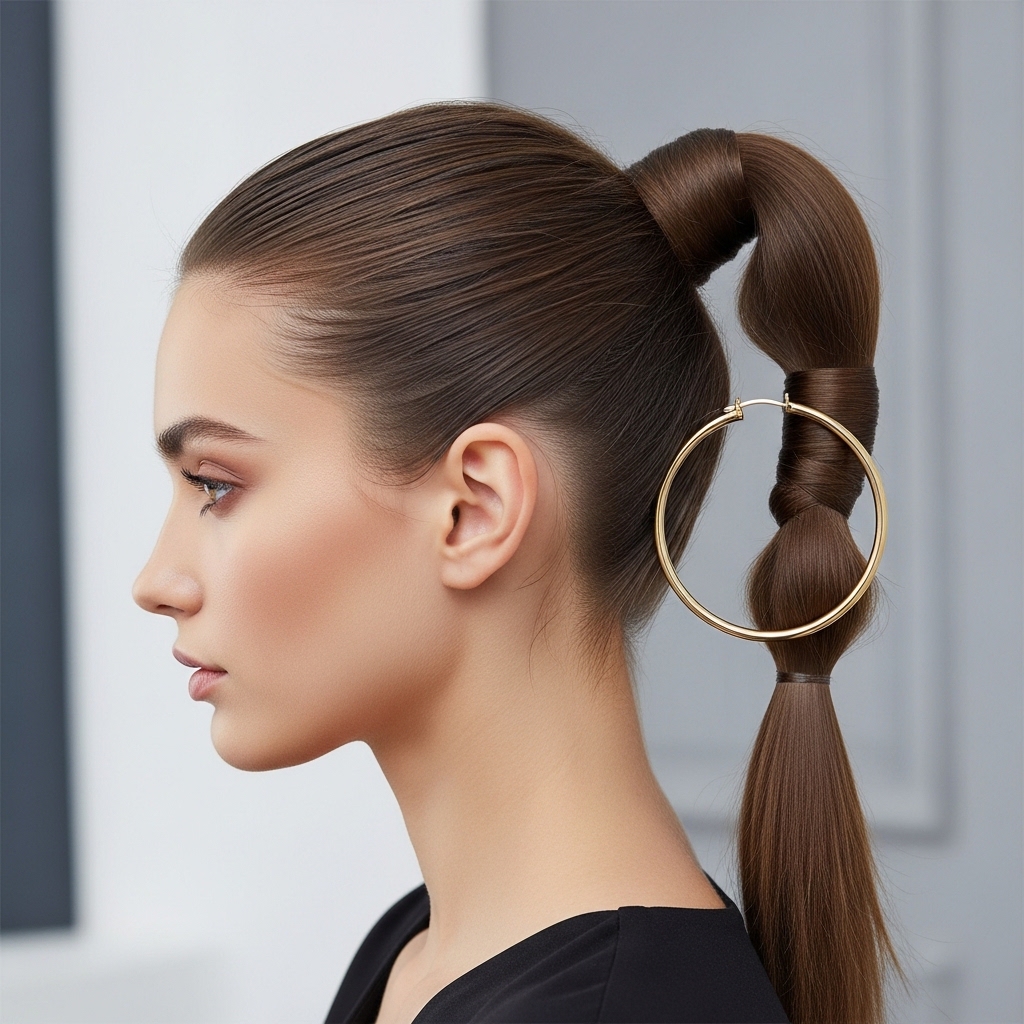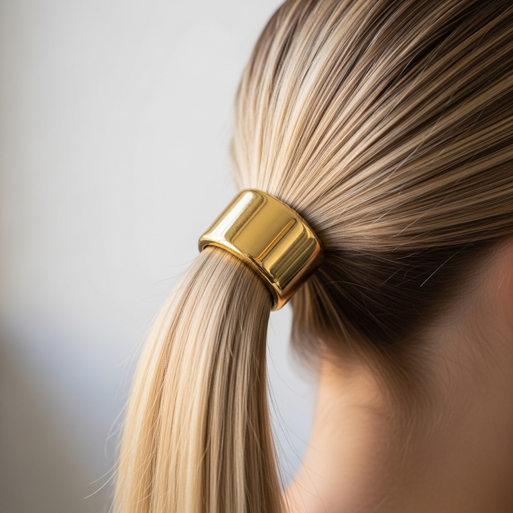 Then, wrap a small section of hair from the ponytail around the elastic to hide it. Secure the end underneath with a pin and slide a simple gold tube bead over the wrapped section for a seamless, expensive finish.