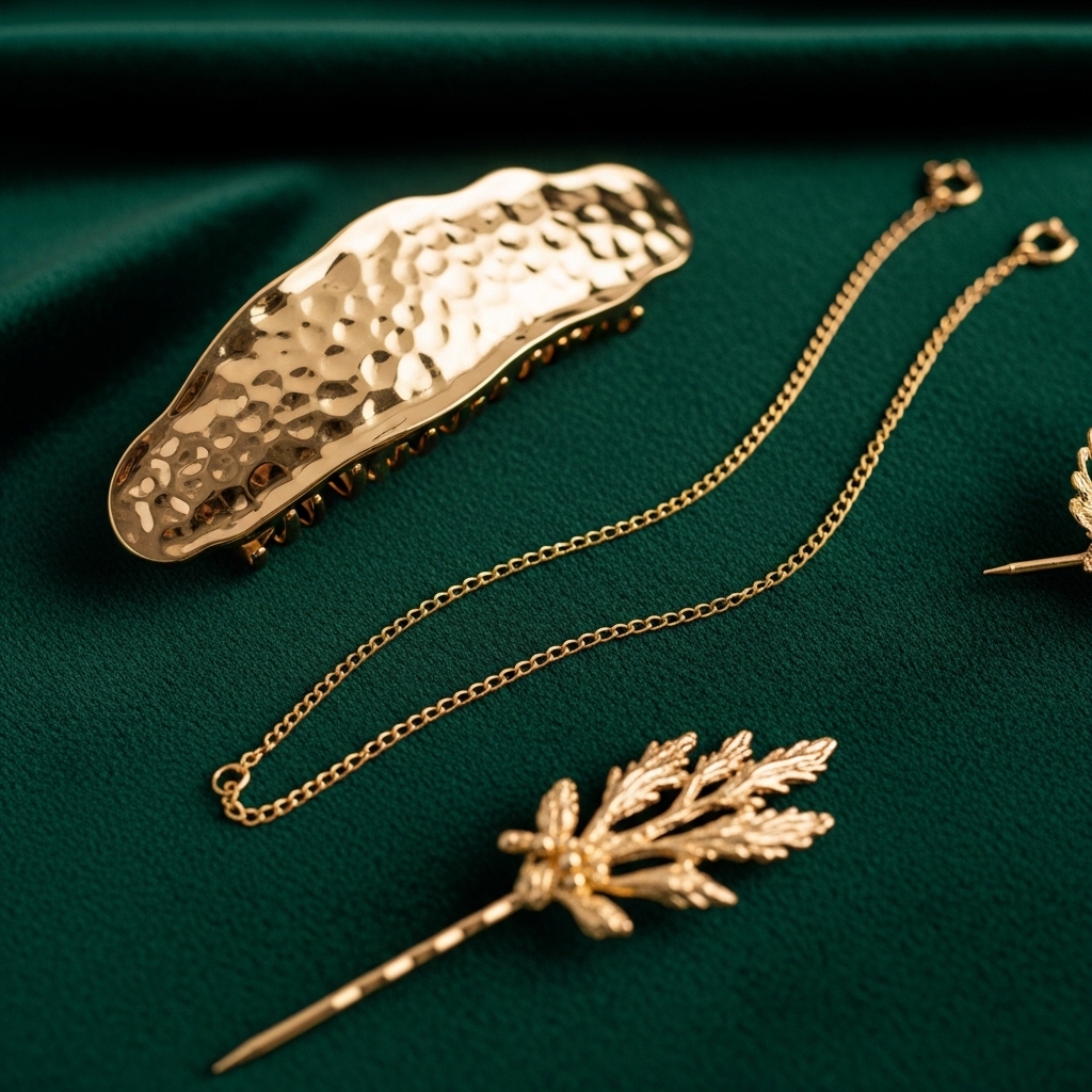 Mix textures for interest: a smooth, polished barrette with a matte, hammered chain. Just keep the color tone consistent so it looks cohesive, not messy.