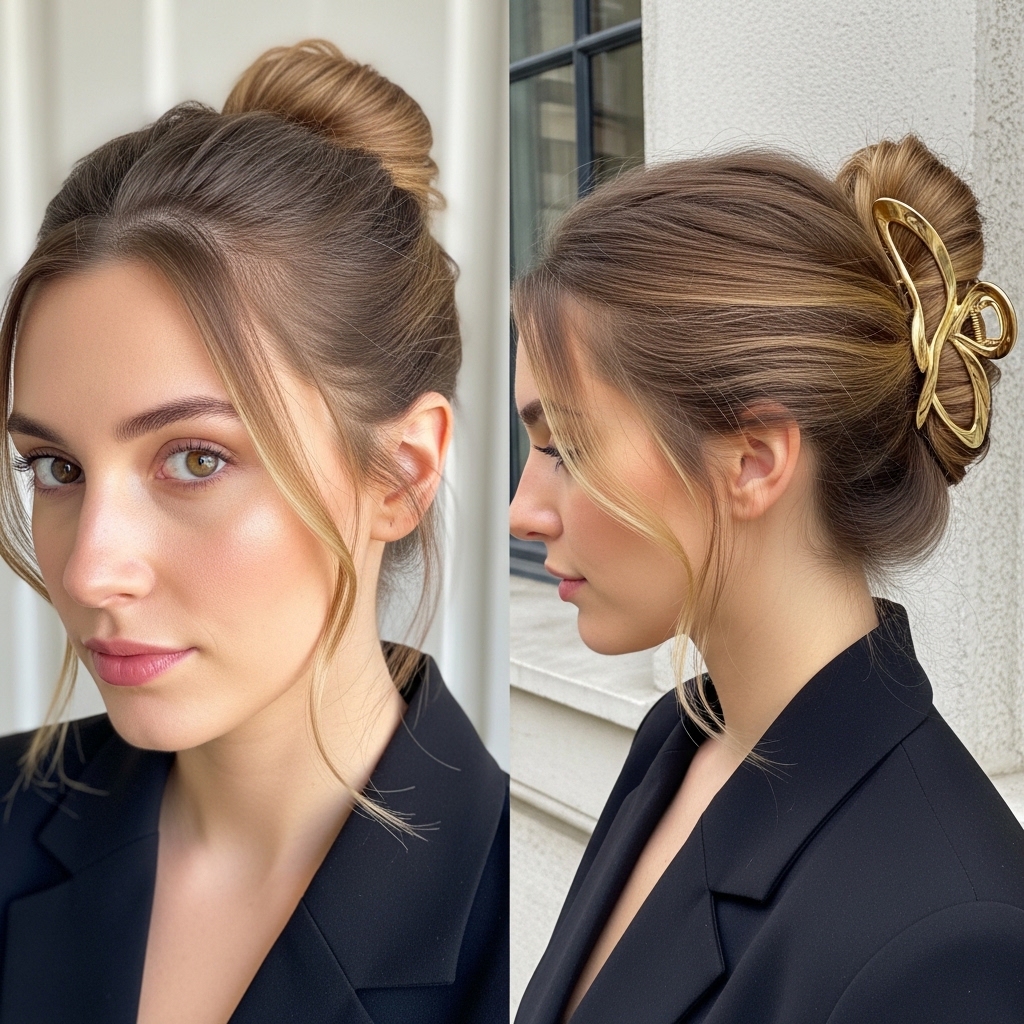Your daytime quiet luxury bun can become evening-ready in 30 seconds. Simply pull out a few more face-framing pieces to soften it. Then, replace your basic hair pin with a dramatic, sculptural gold clip.