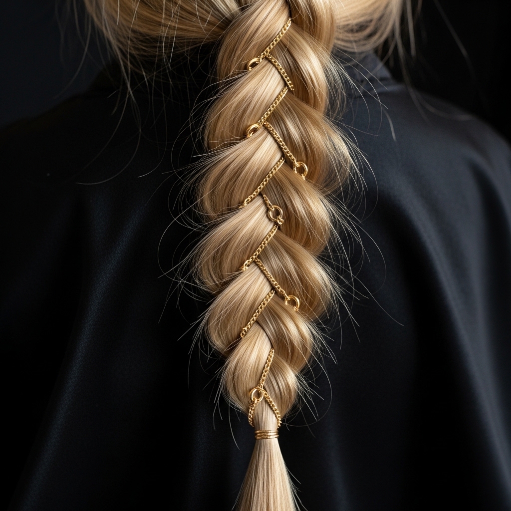 This is my favorite trick. Fine gold chains can be woven into braids, pinned across a bun, or even used as a unique hair tie. It’s that glitchy glam hair detail that feels fresh and unexpected.