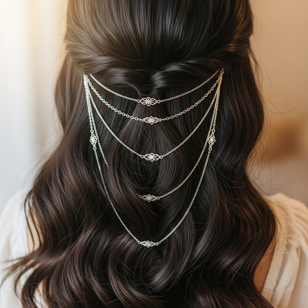 Accessories should complement, not overwhelm. Think delicate silver chains woven into a half-up style, simple barrettes with dark jewels, or a single statement earring.