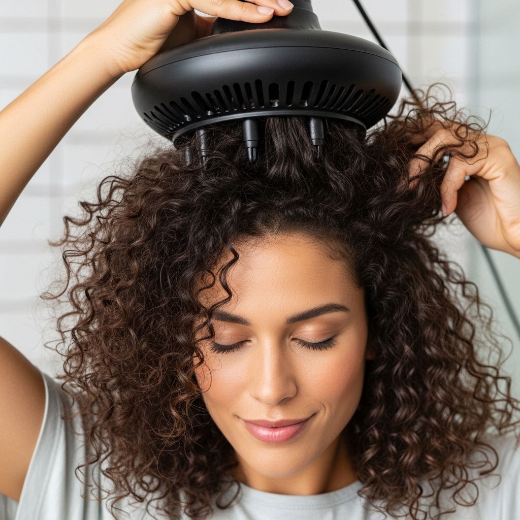 Don’t just air dry flat! Use a diffuser attachment on your blow dryer. Flip your head upside down and gently cup sections of hair into the diffuser, holding it at the roots.