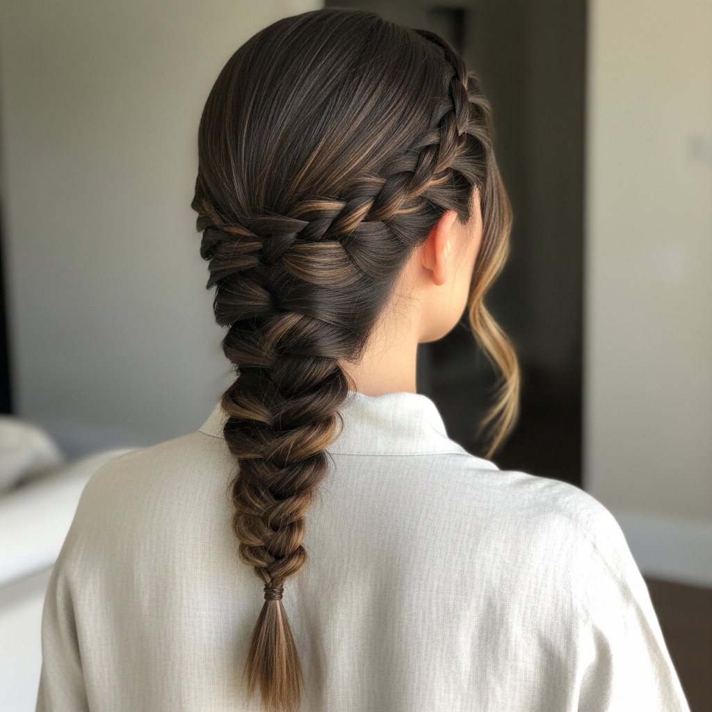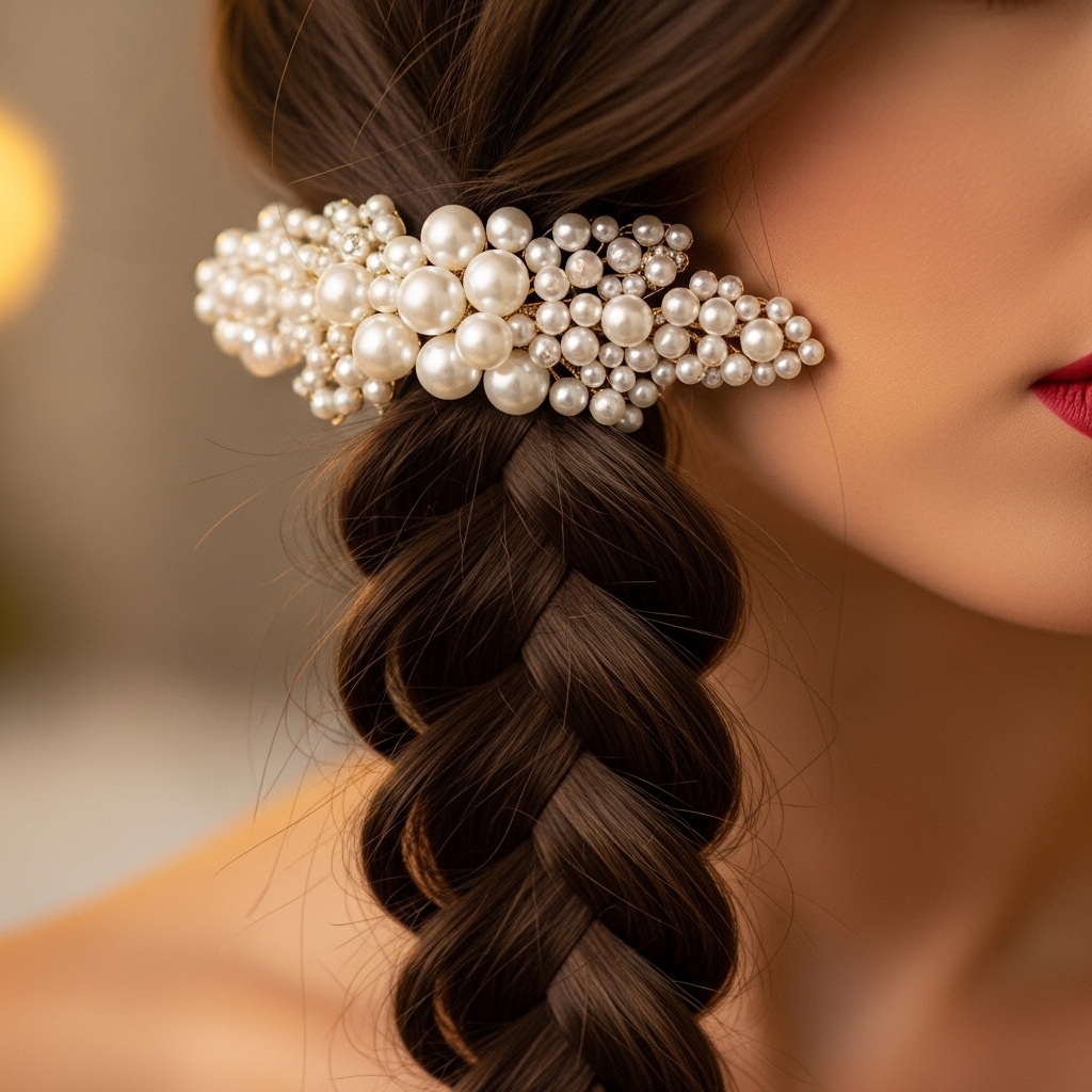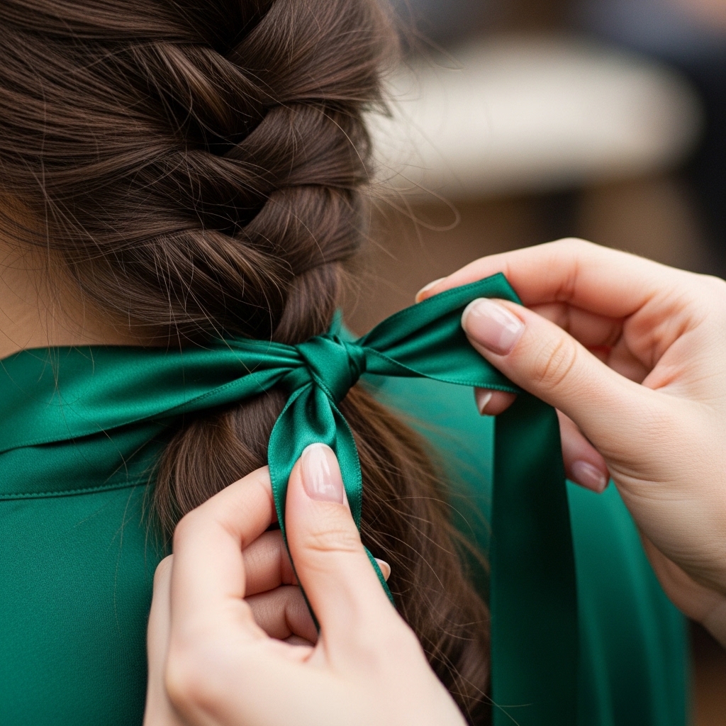 This is where you can personalize it. Take a dark silk scarf, a velvet ribbon, or a delicate chain accessory. You can tie it around the base of the braid where the elastic is.