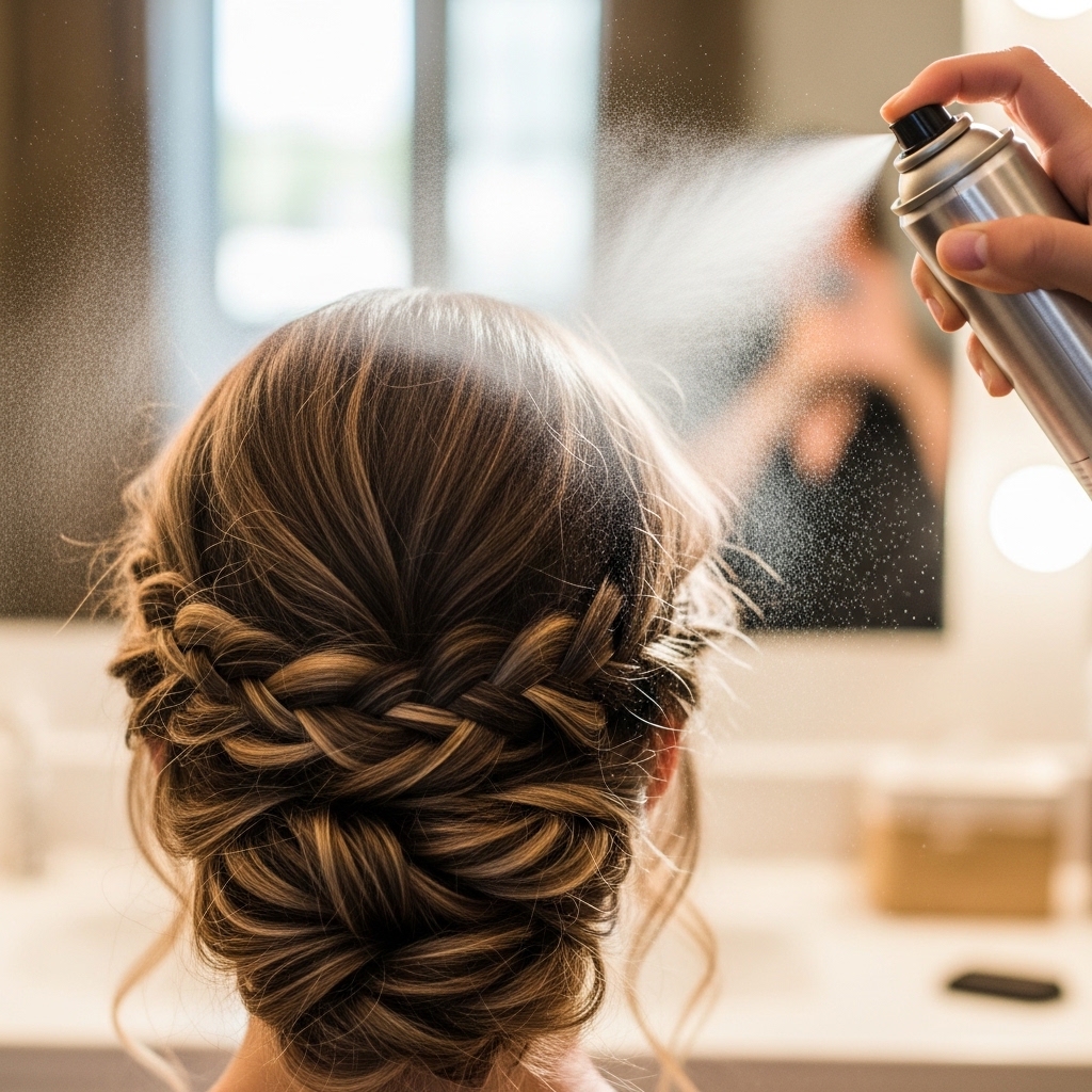 If you have very silky hair, use a texturizing spray instead and crinkle the braid with your hands after spraying. Tuck a few bobby pins around the elastic at the nape if you feel any slipping.