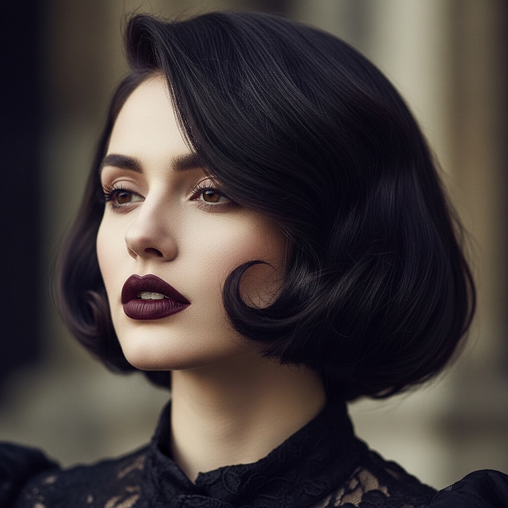 This cut can totally lean into romantic goth hairstyles or vampire haircut vibes with the right styling. Start with straightened hair. Then, take small sections and wrap them around a curling wand, away from your face, leaving the ends straight.