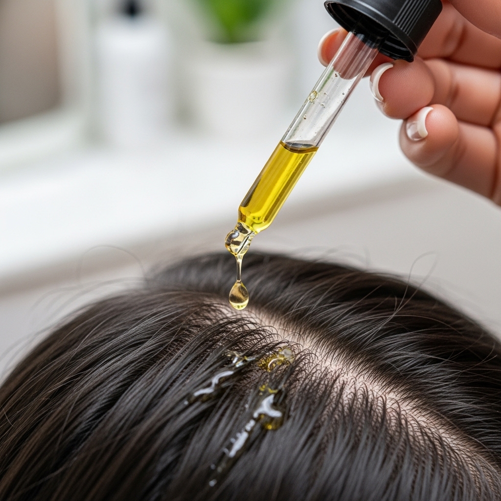 Apply a few drops of scalp serum or oil to your fingertips and massage into damp or dry scalp. Focus on areas that feel tight or flaky.
