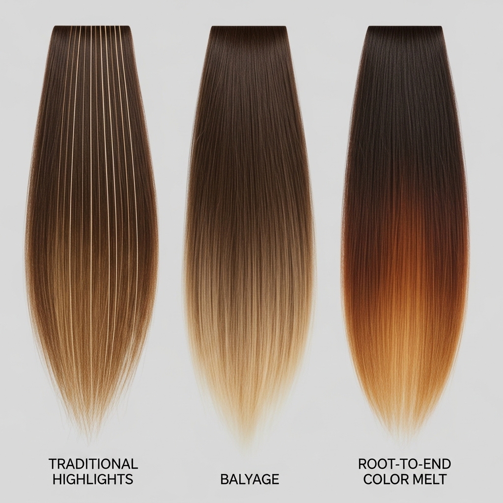Balayage is a hand-painted highlighting technique focused on surface-level, sun-kissed pieces. A color melt is a more comprehensive blending of two or more full colors from root to end.